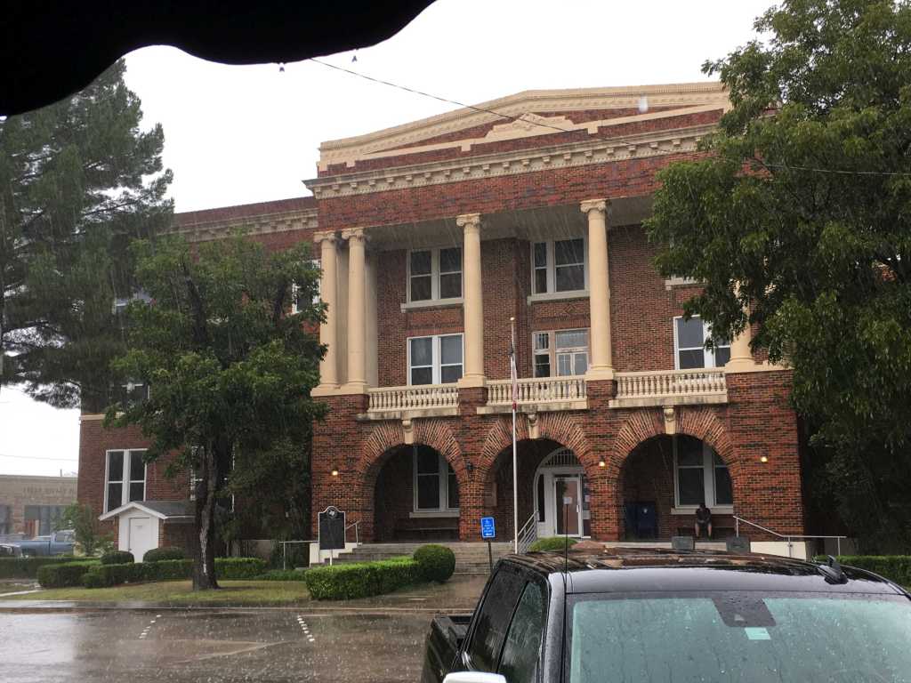 So the rain kept coming down off and on as I came into town. As I came into town, routing led me to a jail, not to the courthouse. I stopped at a convenience store to get directions that were about two shades away from “go up the road a spell and turn where the old barn used to be” but somehow, despite my mistake (turned right at the wrong former gas station) I managed to get there. Of course, it was still raining intermittently so I got wet walking around the building. That umbrella I got back in Fredericksburg was getting some work.