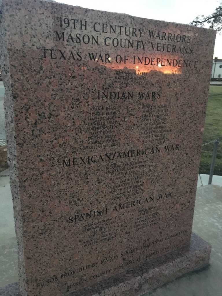 The sun was just down when I pulled into Mason, slowly growing darker as I pulled up to the courthouse. Kudos again to the iDevice for taking good low light photos while I walked the grounds. The most interesting thing of note was the ubiquitous memorial to dead soldiers. As I rolled up on its multiple slabs, I saw the list of Confederate Civil War dead. At the bottom was listed Federal Civil War dead. On the other side was listed Texas Revolution, Indian Wars, Mexican War, and Spanish American War dead with other slabs devoted to other, later wars.
