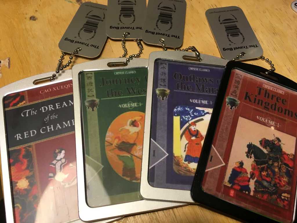 So, there are Four Great Chinese Classics, four novels which are so central to Chinese learning that you are not considered educated if you haven’t read them. Well, about a month ago I got a bunch of travel bugs. About a week ago, it occurred to me that four bugs and four books seem to be a match made in…something literary. I didn’t know how I was going to do it until I was the Mundo del Walton for something (I don’t like that place, but sometimes you need something important at 2AM on Thanksgiving). And then I saw them: badge holders. They’re aluminum frames for holding badges, credit cards (people do that?), or any other card type of thing. They were cheap and easy, which is perfect! So I spent a couple hours on the glorious Intertubes looking for appropriate images and another hour adjusting them to the right size. Follow that up with a trip to where the color printers are and we have art!
