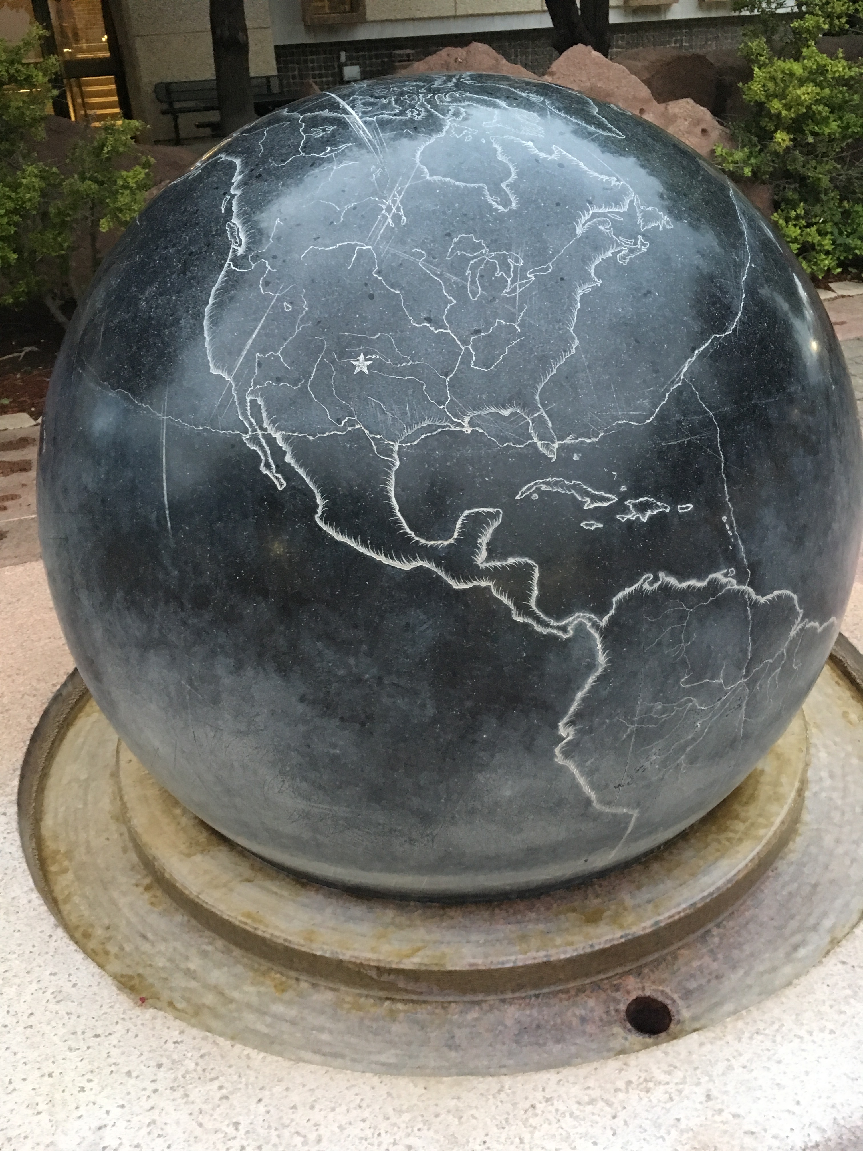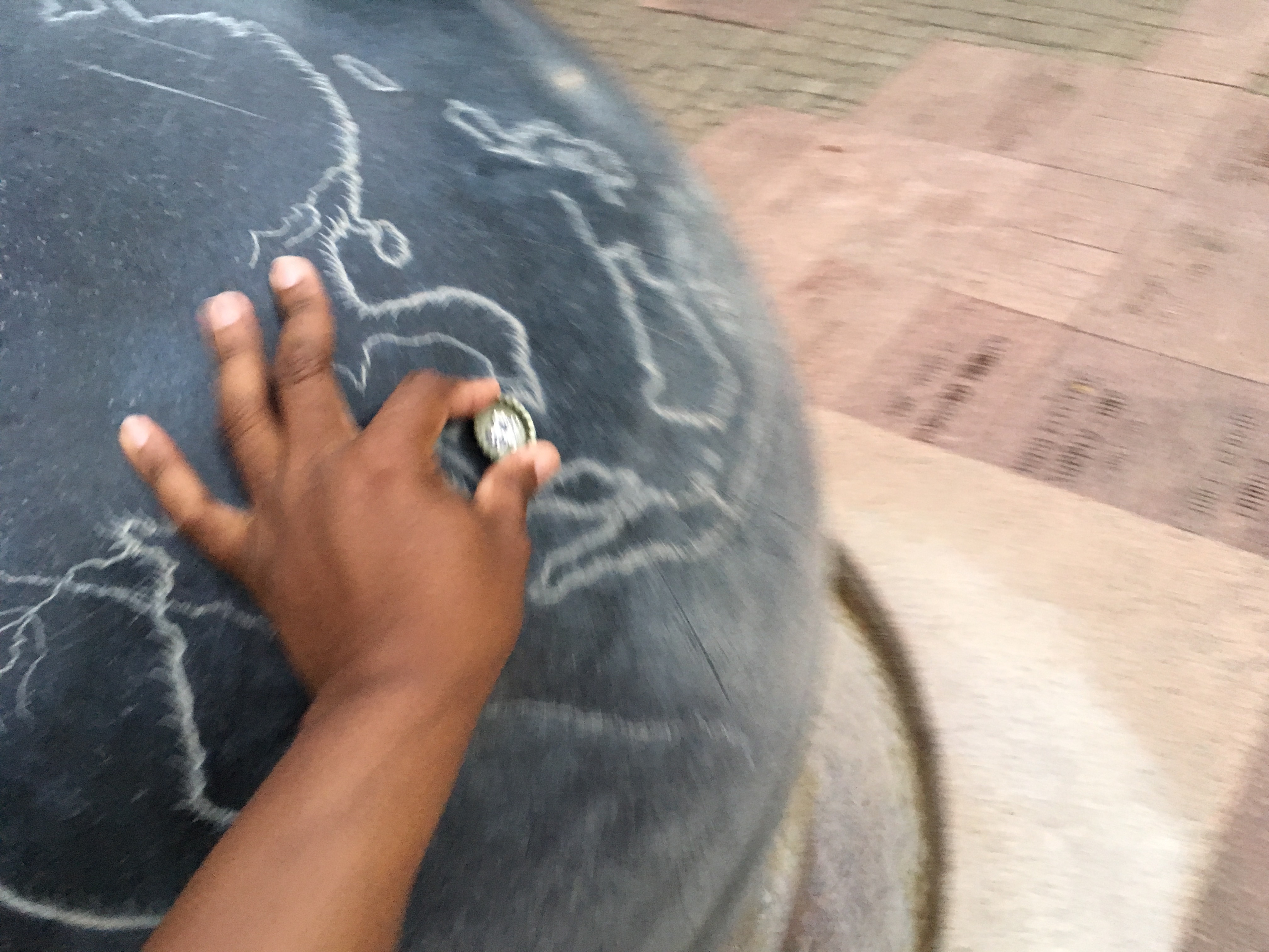 See this big black marble? It’s a 1.5 ton block of granite. What you might not be able to see is that underneath is a jet of constantly running recycled water and, pushing at 10 PSI, that is enough to keep the granite globe suspended so that it’s able to be moved by hand with little effort at all. Quite cool! So, as per the mandate of the virtual, I submitted a photo of myself pushing it.