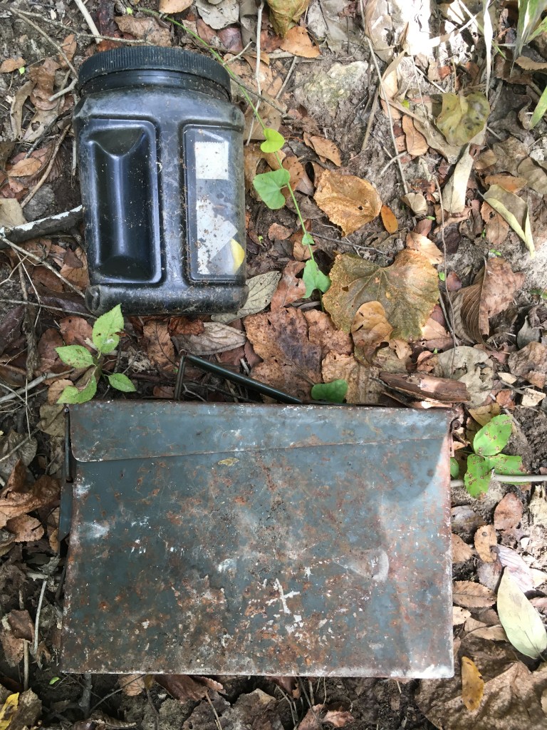 …a plastic jar under a rock. Hardly camoflaged or hidden or something similar, no? I cracked it open and there was a log with signatures from at least 2008 to modern day. Hardly of note or worthy of entry into these hallowed pages or, really even, my attention. I pulled it out to sign and started cracking it open when my geosenses noticed something in the rocks next to me…