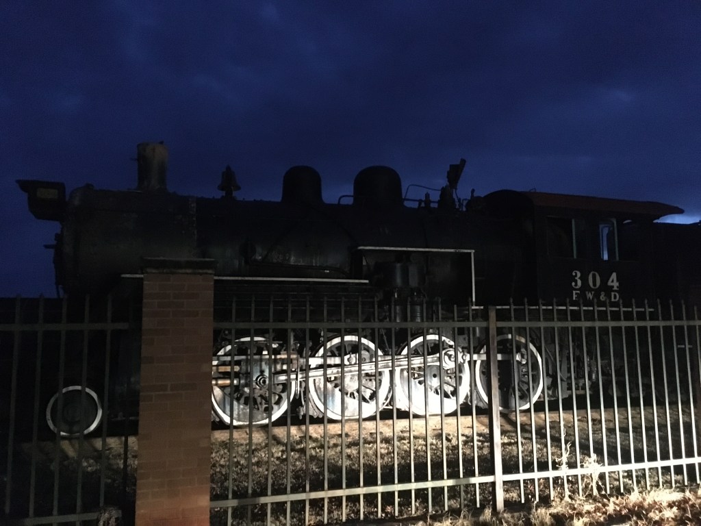 Since I was around the corner, I went ahead and grabbed a traditional, too. It was at a train museum and had a name completely composed of digits, which is cool because one of the challenges I signed in Abilene on the way here was for multiple caches without letters in the titles. Supposedly, the train engine there is the largest trackable in the world, but I couldn’t get to it to find the number. Besides, the entire thing was really creepy. There’s something kind of scary and foreboding about trains at night. Well, maybe that’s just me. As a self-described urban predator, scared of nothing in a cityscape, this gave me pause. Oh, well, I needed to sleep anyway. Since it was already 2AM and I was just waiting until sunrise, I went back to the courthouse to nap until I could take photos. That is, until I was rudely awakened by a police officer knocking on my window at 430… He had gotten a report of someone in the area sleeping in the street (?) so he wanted to know what I was up to. So I told him the truth: I was waiting for the sun to rise so I could photograph the courthouse. That he was fine with and went on his way, but I was awake now.