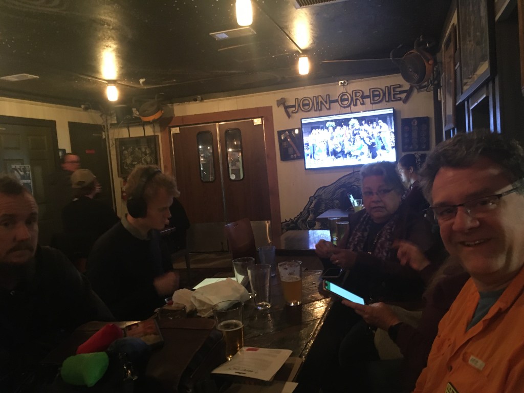 It was a small gathering that was minorly hampered by a) my terrible low light photography skills and b) the guy with the headphones who has nothing to do with us who is desperately trying to block us out. But eventually he left (possibly fed up with the distraction of us, but that’s his muggle problem). The most important thing is that we had good beer, good discussion, and lots of laughs. And the next most important thing was that we got to see the van itself…