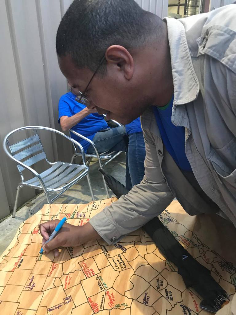 See all those blue shirts? Those are the shirts of the folks who have finished the Texas County Challenge. Last time I was here, I was just a visitor. This time, I was one of the gang. I even got my blue shirt while I was here. There is a tradition where they bring out a giant wooden map of Texas. All the previous finishers sign it on the back. All the new finishers sign it on the front in the county in which they finished.
