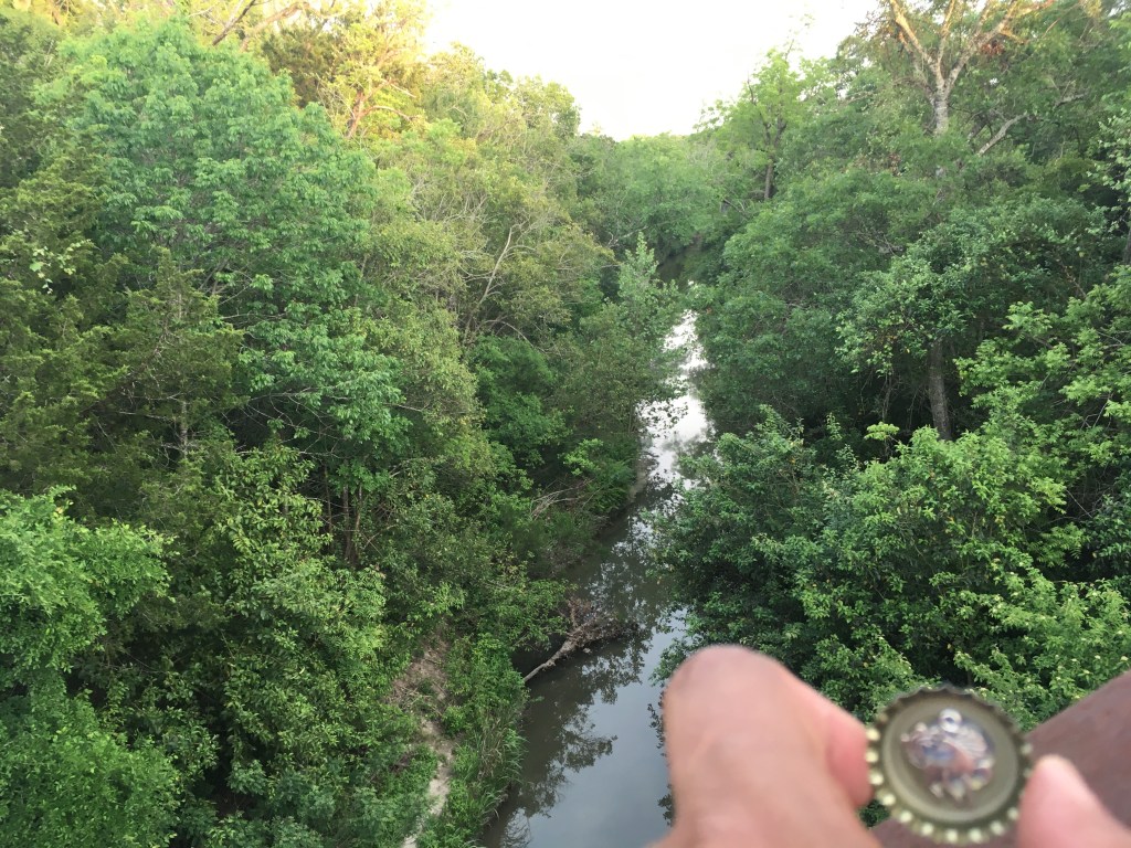 So I added some to go along with the new log. About a year ago, a friend of mine took a trip to Greece with some of his students and he was kind enough to bring me back some Greek Euros. I’ve been carrying these little buggers around with me all that time in expectation of finding this cache. Alright, I talk about it like it some kind of hardship. They sat at the bottom of my caching bag until now, but I like the way I said it. Sounds more grand (or some kind of crap like that). And I went home triumphant. Of course, the next day, I needed a cache, too. So I popped over during lunch. There’s a virtual at one of the trail bridges and I wanted something that I could grab quickly, muggles or no. I did the thing…