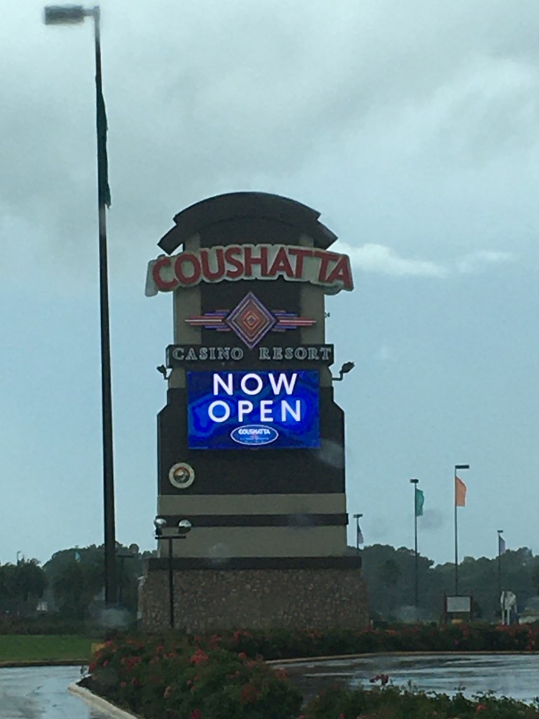 Welcome to Coushatta, the (regionally) famous casino and resort, the largest in Louisiana. Surely some of the bucks it’s making flow through parish coffers, but I guess not an amount sizable enough to change their fortunes. Thus is life. As you can tell, between here and the courthouse it started to rain because I can’t go on a trip without it raining. Why am I here? Because someone was kind enough to put a cache in the back parking lots behind this place. The cache was grabbed, signed, and returned; and then gas and snacks were acquired for the trip to…
