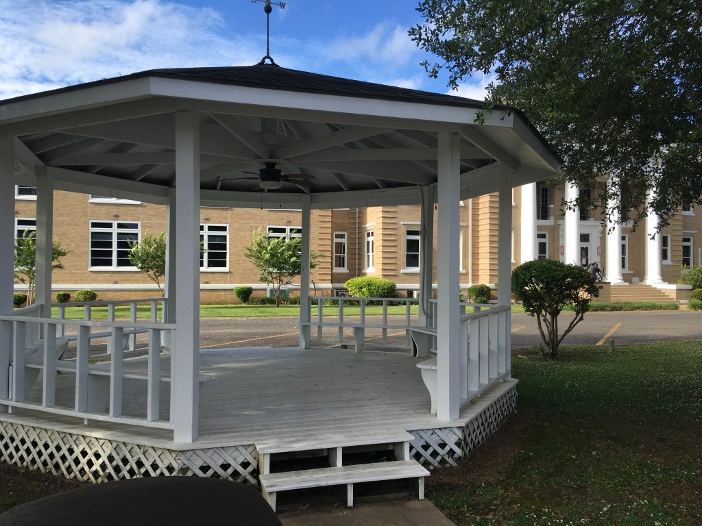 Somewhere around here, I noticed something that hadn’t registered consciously. If you check out that plaque above, you’ll see it’s honoring a Revolutionary War figure. It finally registered that I’m seeing more from the Daughters of the American Revolution than I am from the Daughters of the Confederacy. Those Revolutionary War vets moved out here and eventually died here and I expect I’ll see more of that as I go east. Once that was all mentally processed, I got ready to look for a cache. Guess where it was? The theater! In fact, if you look closely at the photo above, you can see it! And for those of you who can’t…