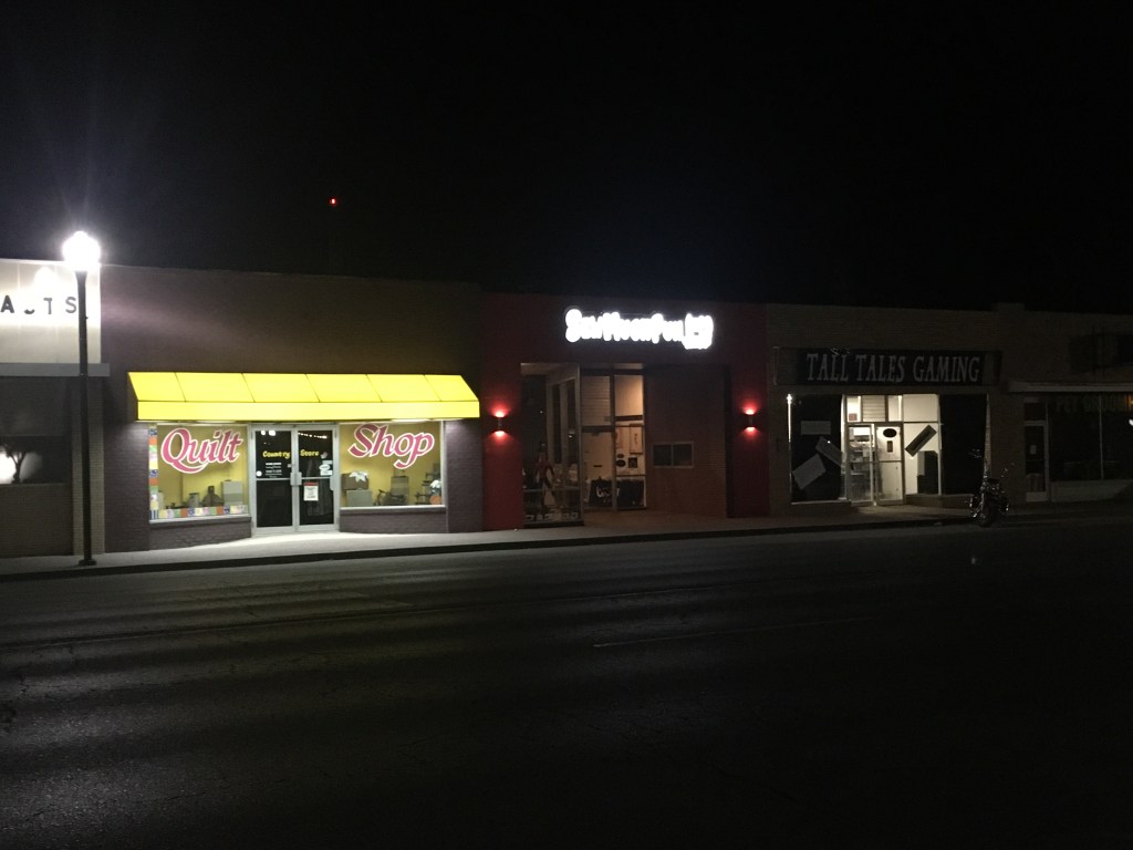 As a weird side note, there was enough light to photograph the war memorial at the courthouse, but across the street was a game store. Imagine my surprise to see that they were still open and people were in there playing! On one level, I was a bit concerned with the lack of social distancing in the time of cholera, but on the other hand, my gamer heart was warmed a bit. A game store is a game store is a game store much the same way that a cache is a cache is a cache. Some things never change and, thinking back on all the times I was at Dragon’s Lair at some ungodly time of the morning, I am glad of it. But enough lollygagging! Now that I was done here, I headed on down the road to make an early arrival at my next destination…