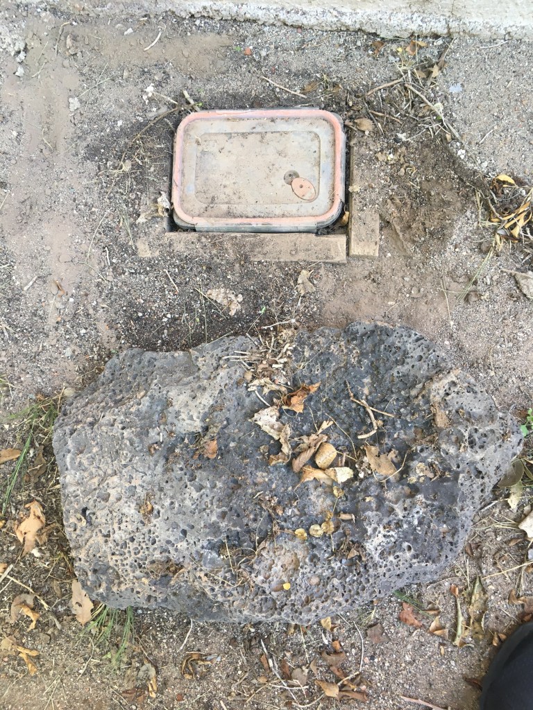 The cache, on the other hand, was slightly more interesting. I was a little concerned as I approached it because I thought I was coming into someone’s back yard. Instead, it turned out to be the side of a business that had a “crop circle” on it. And beneath the circle? A rock. And under the rock?