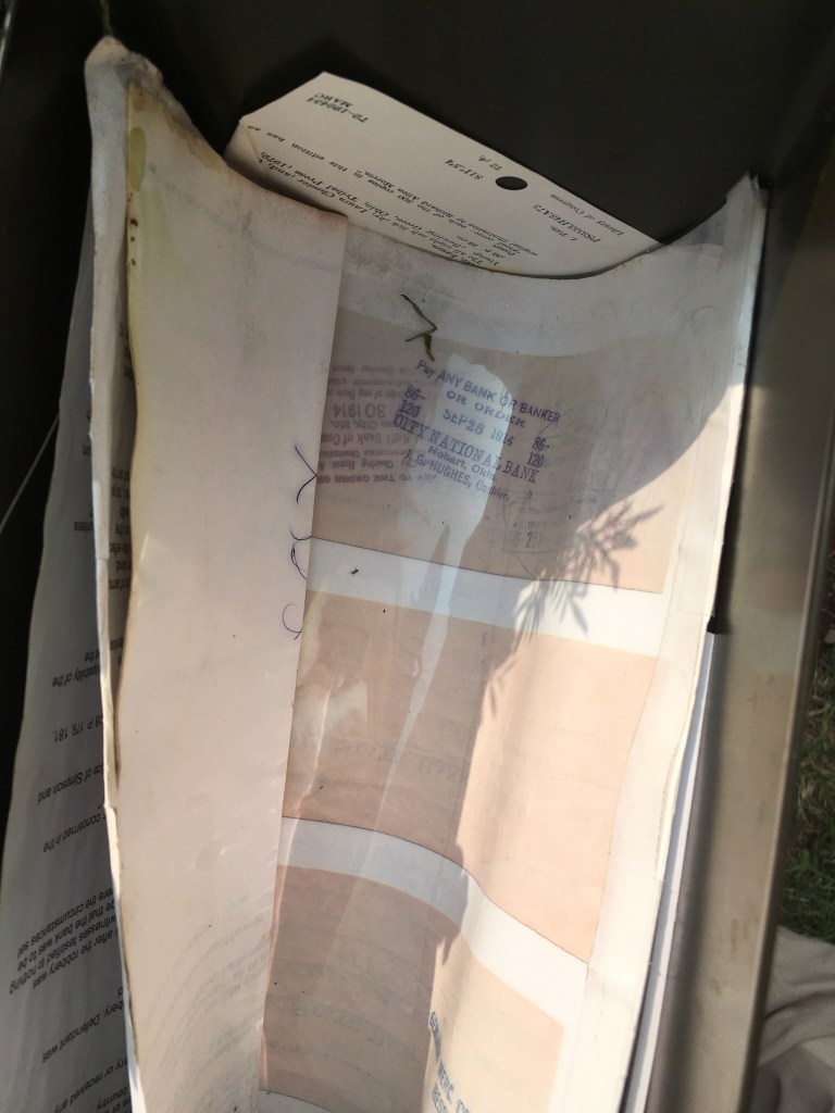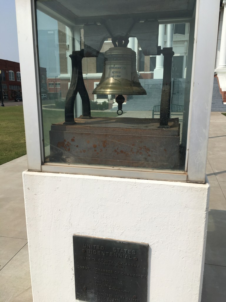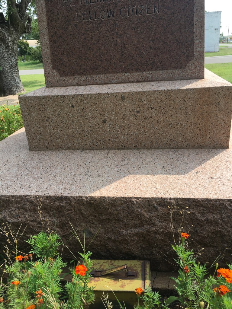 I stopped on the way to Cordell in the town of Bessie for my cache. It’s devoted to a bank robbery that happened here in 1928. Unfortunately, Ben Kiehn, WWI hero and local citizen, was killed in a shootout with the bank robbers, and his killer was never caught. The state bankers’ association erected this memorial to him and at the foot of it…