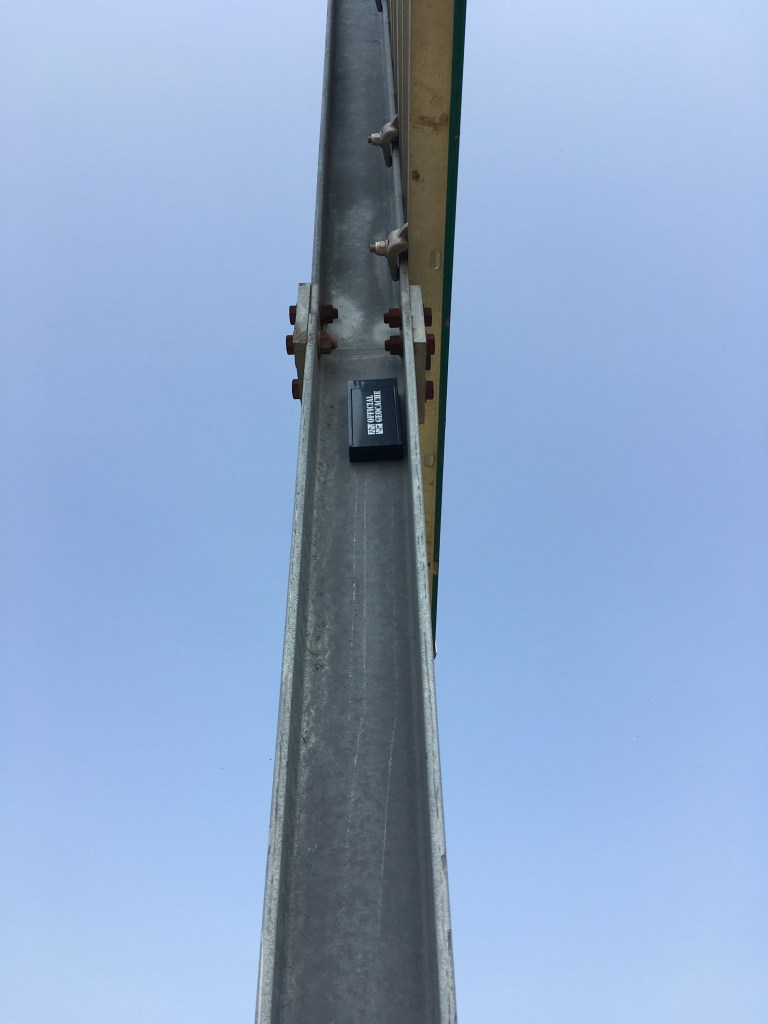 Wait… What? So I warmed up the map. Of course there’s a cache on the sign! DEUS VULT!!! After turning around on the highway so I could get back to the sign, I attempted to get it. The cache page said that it was under the left foot of the sign, but there was nothing there. I looked at the size and checked the recent logs and then found it…
