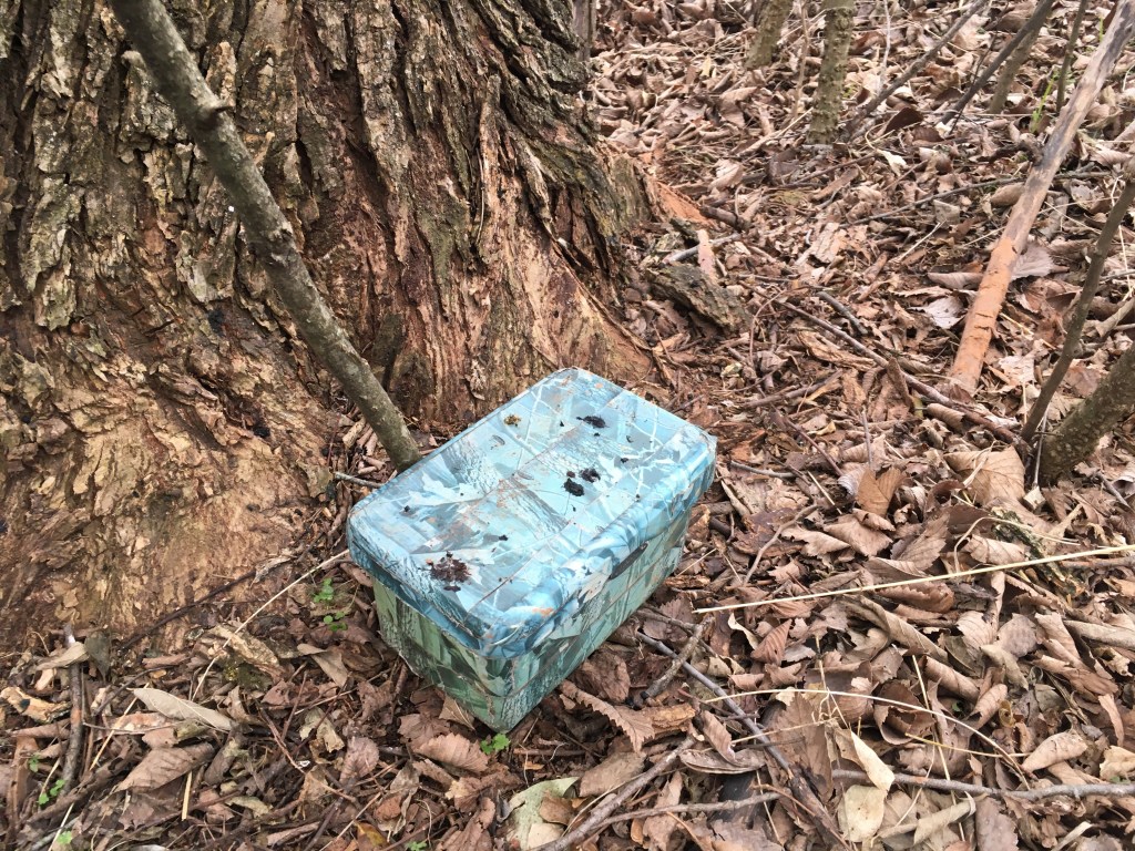 The cache was in a little wooded area off the side of a road. If I had gone in the direct way, I would have landed on it immediately. I, however, did not take the direct way. I ended up taking a little trail that went in and wandered around for a little bit, signal bouncing all over the place, until I stumbled upon the horrible truth: the cache was in the first place I looked for it, but somehow I didn’t look at the back side of that tree. The last person to log it reported it was wet. Since it was freezing when I found it, the pages of the once wet log were frozen together, a first for me. I had to peel them apart to sign it, and felt as if I had reached another rite of passage. At least the way out was easy (as the way out often is). I was shaking with both anticipation and cold as I got back in the car. I was about reach a special place with a special cache. Glee and expectation were my copilots as the car warmed my bones on the ride to…