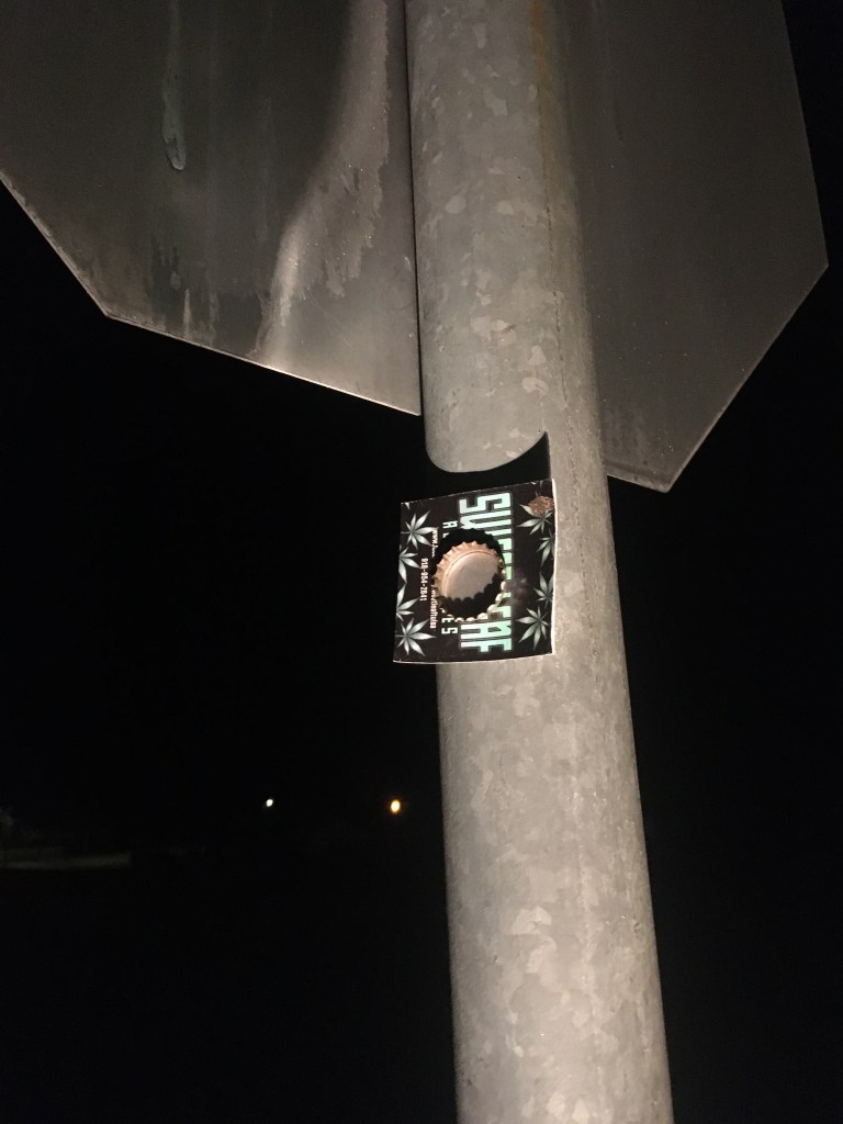 Wait… What? What am I looking at here? Yes, ladies and gentlemen (or however you identify—I don’t mean to be gender assumptive), that is the cache. In its current incarnation, anyway… There was a magnet that was either epoxied, or possibly welded to the stop sign pole. I don’t think it can be welded though, because the heat would screw up the magnetic field, ruining the magnet. The other side is a bottle cap, with a log (and an ad for a head shop) sandwiched in between. I went ahead and signed it because a cache is a cache is a cache, but I’m pretty sure this is illegal at this point. It has no container and, honestly, it’s one of the most disappointing caches I’ve seen in quite a while. I swallowed my pride and signed it. I wish I could say something more charitable about it, but I can’t. Instead, let us focus on the obvious question hanging in the air: if I was going to skip Sallisaw, where was I going? I was venturing to arrive in…