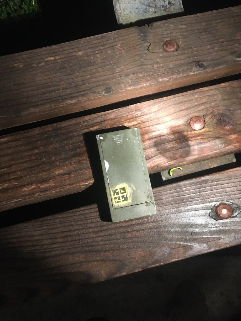 For the second time this trip I got the nice little message welcoming me back to Oklahoma. The drive here was actually quite strange. With the roads slick because of rain and mud and the lane and anti-slide assists on, I could feel the car sometimes move itself of its own volition and I wasn’t always sure which one of those was causing it. An odd feeling indeed to not know if you’re sliding or being kept from sliding… Unfortunately, the courthouse wasn’t illuminated to the standards I had come to expect of Oklahoma. Those two lights right there pretty much killed any detail in the photograph. Unfortunately, I didn’t have any other facings I could photograph because the only other good one was covered by trees. As always, I took what I could get and then prepared myself to find a cache.