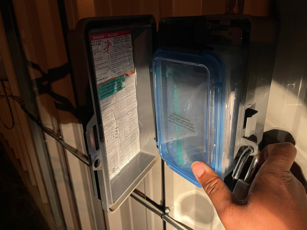 …if by “far afield” you mean about six blocks away. I ended up at the Perryville Fire Department. On the side of the building, behind a small radio tower of some kind, there was a combination locked box. As the hint was a number that corresponded to the number of tumblers on the lock, the box was quickly opened and the cache was revealed. I threw in some swag and a trackable with the now signed logbook before returning it and closing the lock before making my way off to…