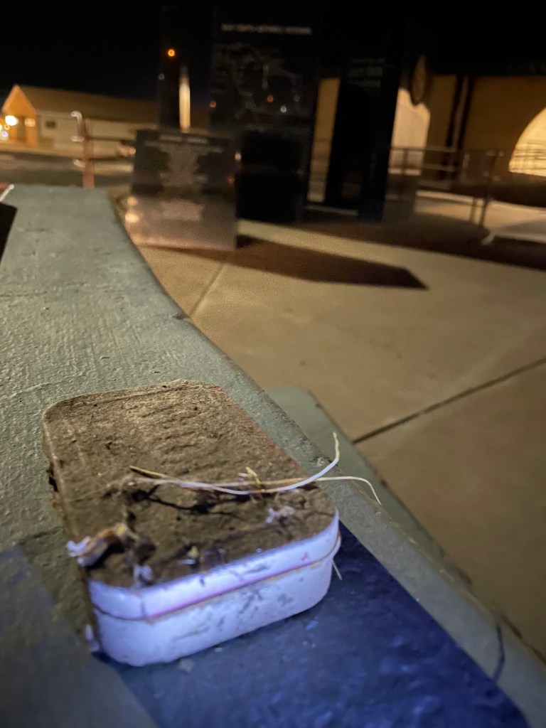 Someone was kind enough to leave a cache at the county Veterans’ Memorial outside the courthouse. It worked out nicely because I really didn’t feel like going to get one from elsewhere. Sure, it probably would have just been a Virtual (there were several around town and I pretty much figured this entire trip would be mostly Virtuals of one kind or another), but there’s something to be said for getting your hands dirty and using the good old Mark 1 eyeball to find the thing. That and, between the disappointment of my precluded travels and the unexpected slog that was Phoenix, I was uncharacteristically worn out. I really didn’t expect that. I napped at the airport and on the plane. How could I be tired? I’ll usually drive all night to get to my starting destination and then roll the rest of the night and all day and into the evening before I’m ready for some sleep. That wasn’t important. All I knew was that I was drained. I pulled into a local Wally World and caught a few winks. After a few hours, I was alert again and ready to go. I got to driving and then noticed my nightmare was beginning. Solid flakes were falling from the sky! It was snowing, and I didn’t want any of that! I still have a few neuroses about driving in rain, much less in snow! I took it far slower than normal and inched along for what felt like forever until I finally made it to…