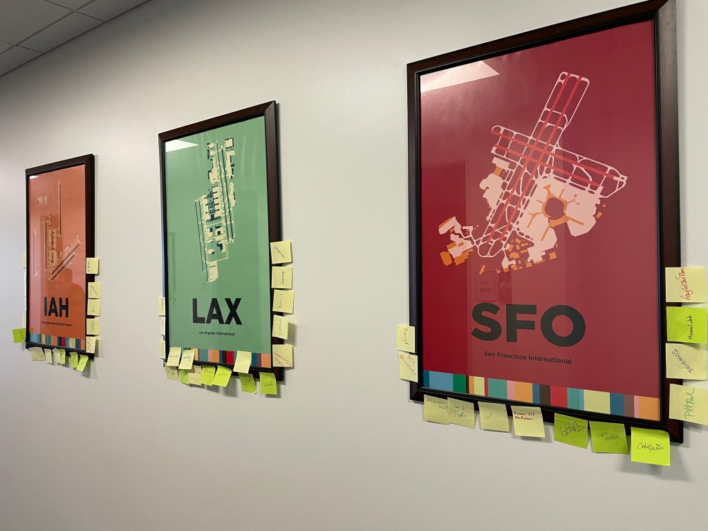 The next morning, I went to the Thursday morning Event at a restaurant at the Conroe Airport. The log for the Event turned out to be the top photo. The hallway to the restaurant was lined with posters depicting various airports. Logging required marking every airport you had been to with a signed post-it note. I had been to five: Dallas, Boston, San Francisco, and the two airports in Houston. I met a couple of people who had been to all eleven, including all the foreign ones. Sure, they had multiple German airports, but no Gatwick? Killing me, Smalls … Once I had some breakfast, I went out to get some more Labs.