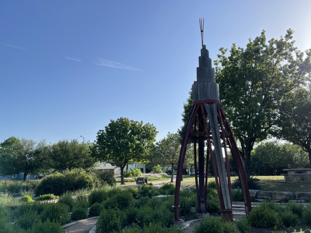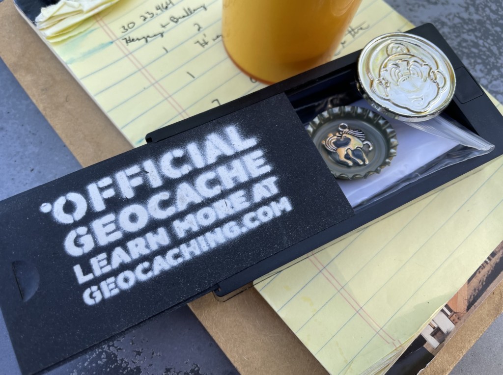 The cache was magnetically attached about four feet above my head to the interior of this art installation in a park. What you can’t see in the photo are the picnickers sitting on the benches to the left, the lady doing a photoshoot of her children to the right, or any of the myriad runners, joggers, and walkers (with and without dogs) buzzing around in multiple directions. Stealth would be required, but how does one employ stealth in the middle of a well-populated park in the middle of a sunny day?