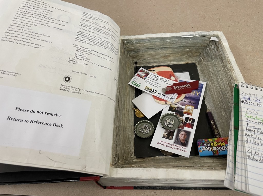 … a library! I don’t usually have the time to do library caches when I’m on the road because it’s not common for me to be near them during library hours. This time it was the middle of the day, and I needed an excuse to get out and walk around a bit, so why not? The description said to look for a certain reference number, but when I found it, it felt strange. Of course, reading is fundamental. It took me a moment to notice the big red letters that read, “Ask the reference librarian for this book.” I went to the younger librarian at the desk, handed her the fake book, and asked if there was a real book. She looked at me strangely for a moment until the older librarian stepped in and told her, “Hey! You haven’t seen that yet!” The older librarian produced a book with the same title as the fake and traded with me. And voila!