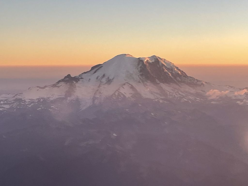 If I am not mistaken, that is Mount Rainier. I got quite a shot of it as my flight approached Sea-Tac. I didn’t manage to get what would undoubtedly have been a great shot of the airport sign welcoming me to the city because I left my phone on the plane! Luckily, that crisis was resolved satisfactorily, and the phone was returned to me after a minor, panic-inducing comedy of errors. Driving was accomplished, and I made it to my hotel for the night to write this for you all. In the morning, though, my epic journey will begin with my first official cache of Washington State in…