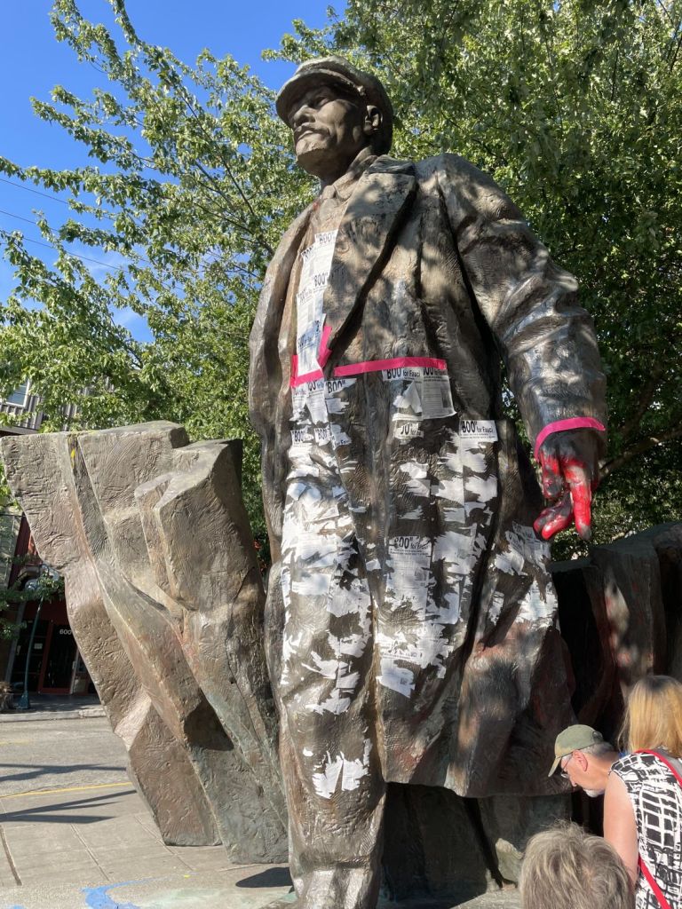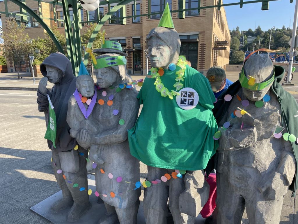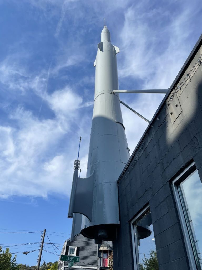 Oh, yes, we cached. There were tons of Adventure Labs on site, but we got out and got to the job and then some. First, we stopped at the Space Needle grounds at a totem pole with a cache attached. It was easy enough to find because, as you can see, there were already cachers there who had it in their hands. And this was before we even made it to the car! But then my eagle eye noticed something … unusual. Remember I mentioned there’s an Unknown Cache here, and you need to go to the top of the Space Needle to solve it?