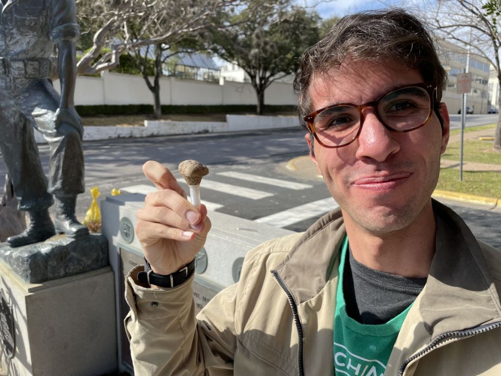 A couple of months ago, I decided to go for a cache, the bonus for an Adventure Lab series, in the middle of downtown Austin.  I parked close to GZ, a monument in the shadow of the state capitol, checked the cache page, and then noticed some people hanging around at the statue.  I waited for a minute for them to move, but as I watched, I recognized the familiar signs: poking around in the dirt, constantly checking a device, spreading out to examine the entire area.  I was 95 percent sure they were cachers, so I approached them.  And I was right!  They were there looking for the same cache I was.  I was even recognized!  That never stops being a weird feeling, but that’s beside the point.  We chatted and searched together, but there was no joy in Mudville.  The cache eluded us, but we resolved that we’d take another shot at it at some point in the future.  We parted ways and went on with our lives.  A few days back, I got a message from one of them, Escondido70.  He’s from the Houston area and going to school here in Austin.  He was back from the winter holidays and invited me to take another shot at our elusive prey.  We got together again over the weekend at the same place and, with a trowel and further guidance from the CO, found a rock with an attached DNA tube accidentally covered over by dirt.