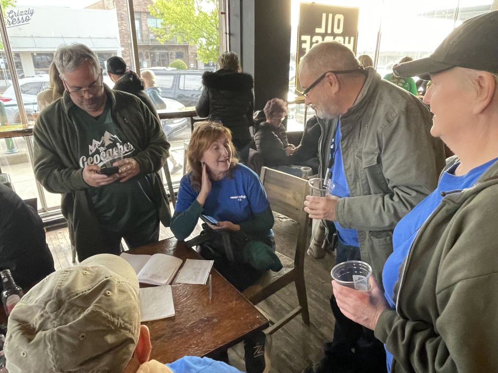 The Reunion had a complication that couldn’t have been predicted: the weekend’s temperatures dropped from warm springtime temperatures to chilly and freezing in some areas. That made the outside activities less desirable. We were also sharing a downtown intersection with a Saint Patrick’s Day street party. We signed the board to the dulcet tones of the band I began refering to as Generically Celtic (which I think would actually make for a good band name).