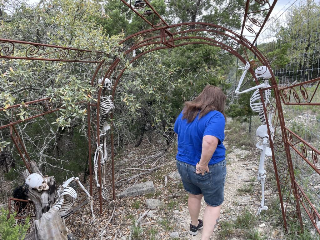 We went through the gate and followed the path. I’d been there a number of times, but this time I was thrown by a new wrinkle. Every time I’d been out before, the lock on the cache had been broken. Now it had been repaired, so we had to bounce around looking for the clues to open it up! But we found what we needed, and treasure lay within! We used a quarter for what it was for (if you ever go, trust me and take some quarters) and took in a view of the Hill Country. I grabbed a trackable while I was there, and she gave the cache a favorite point because it deserves them all! We were about ready to call it a day, but she noticed that I hadn’t logged any caches myself, which is true because I had already found all the ones I took her to. She insisted that I needed to get my daily cache. We popped over to a nearby park for a little walk along its trails and found a sturdy old camouflaged PVC pipe with some damp swag and a log inside. Mission accomplished.
