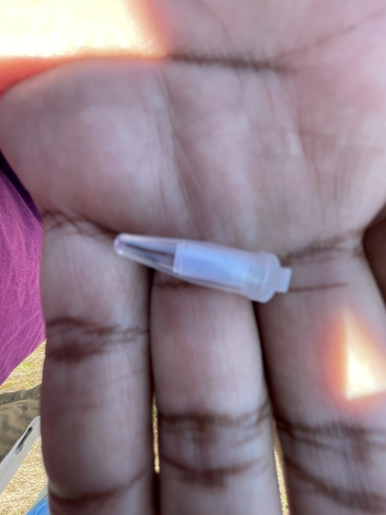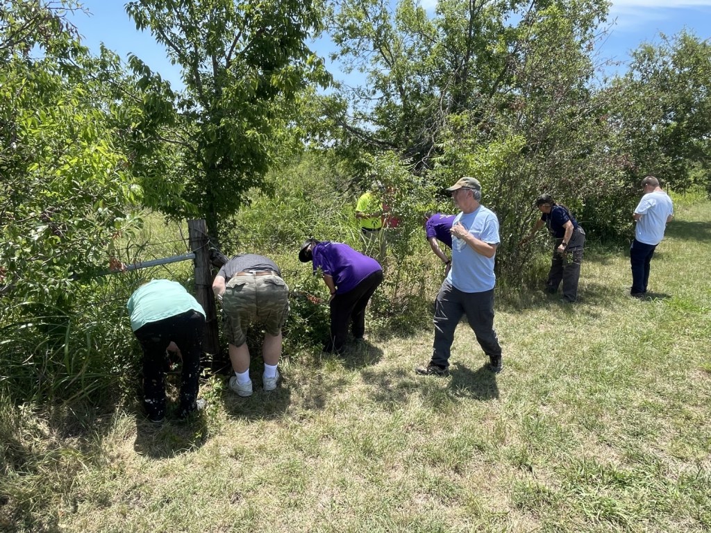 …the “Evil” hides dropped. One of the hosts is famed for his annoyingly evil placements and was tempered for the most part of the Geoart by the others. But about thirty of them were made to be truly rough. I personally only participated in two of those, but they were both ones that I knew I would never discover on my own. The first was a DNA tube attached to a short fake vine in a tangle of vines. Ten of us looking, all pros at this game, would probably never have found it were it not for the good luck that Tygress, besides being an artist, is almost intimately familiar with Texas flora. She caught that the leaf on the fake vine was not quite right and just a shade of green off from what it should have been. We knew the other one had already been found, so we knew the right friend to phone for a hint. It turned out to be a rusty nail head with a log twisted around it in underneath some barbed wire on an ancient fence post. I and several others chose that moment to call it a day. We had already been running around all day, and the idea of baking under the sun for who knew how much longer, looking for things more difficult to find than needles in haystacks (we all had magnets, so a needle would have been child’s play comparatively) did not appeal to us. As the truest of the true diehards sought out the “deeeep hurrrting” hides, we, along with many others, said our goodbyes, and went to get some barbeque. We had all done a yeoman’s work that day. It was time for some well-deserved rest.