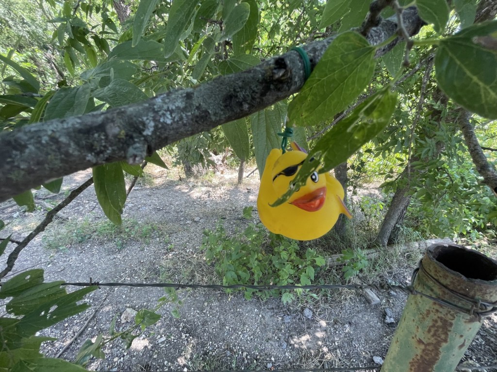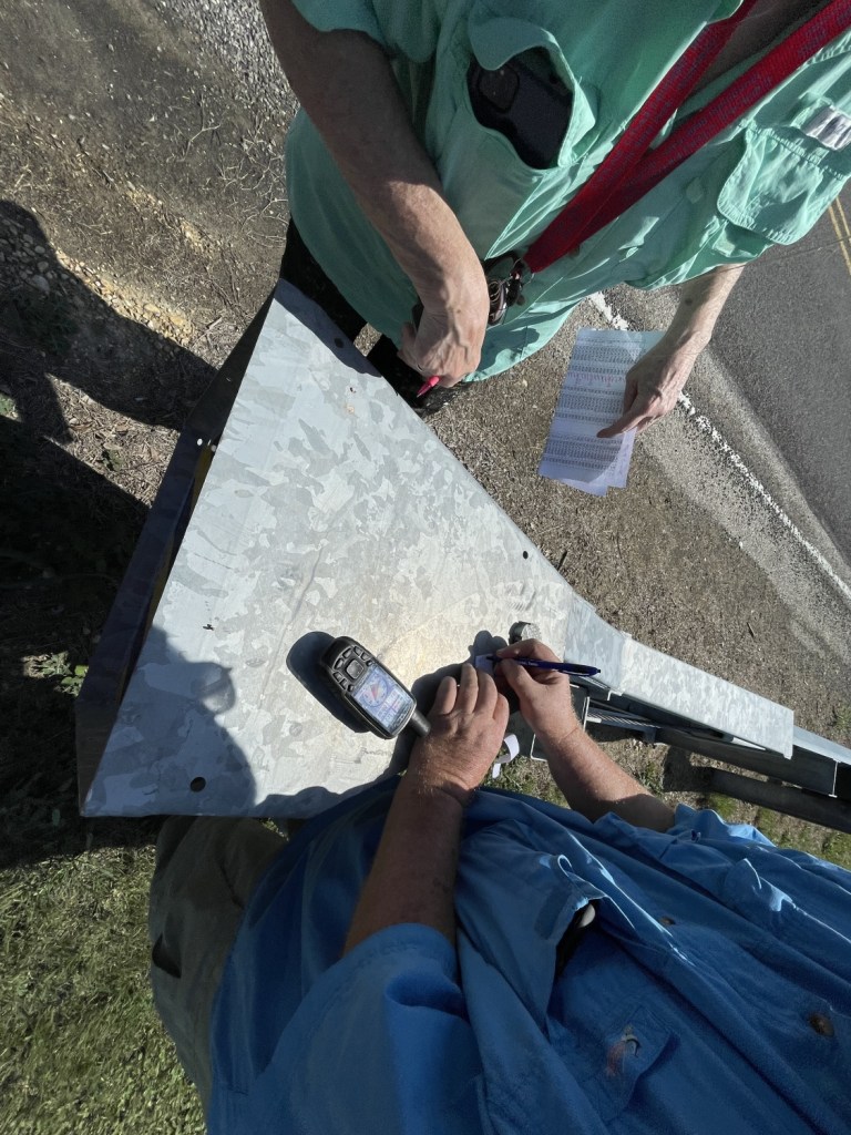 The Scorpion Expeditionary Force (SEF) and I had long been preparing for this past weekend. Its de facto leader had long ago told us that he, his wife, and another cacher had been working on a giant duck-themed Geoart to replace the many different and recently archived ones spread out over Williamson and Milam Counties. Indeed, if one goes back through archives, one will find a lot of entries about and mentions of those now-retired caches. For at least a couple of months, we’ve been providing old photos of cachers and gatherings to provide grist for the Jigidi* mill. We’d heard about the long days on the road placing new containers (and picking up old ones), the bleary eyes from creating cache pages, and the general level of exhaustion from all the other things involved. At least a couple of weeks before, scuttlebutt about it started getting out there on the grapevine, so when the weekend came, we had a pretty good inkling that it wouldn’t be just us here attacking this thing. Imagine my surprise when I finally made it to the rally point for the day.