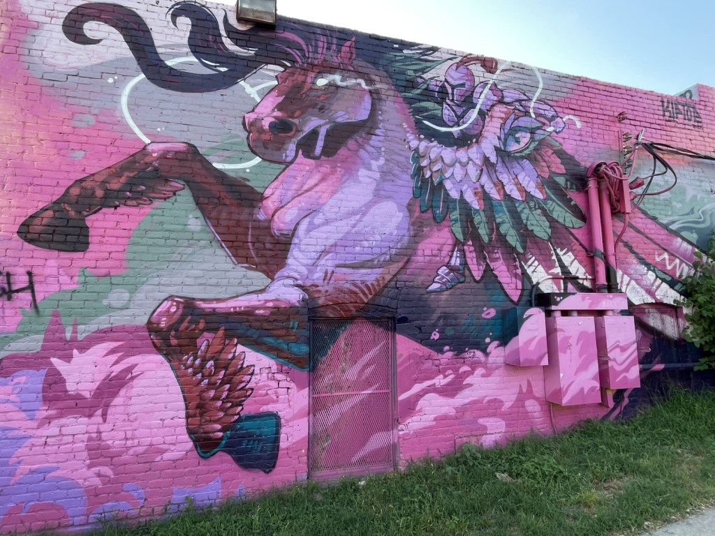 The following day, we opted to stay closer to home. After I got off work, we went to see a movie and then find a cache. We ended up going to downtown Austin and another of the mural series I had recently found so many of. Unfortunately, the cache wasn’t in the shade of the murals but across the street from them. In the morning, it would have been great. In the afternoon, the Spear of Apollo was gently but consistently poking at us. Luckily, it didn’t have too much of a chance to assail us. Once the cache was found, we quickly retreated into the shade to do our necessaries before returning the cache and going home. As we talked about the mural, I could only think about how the country and the city offer different experiences, but for people like us, they offer the same allures.