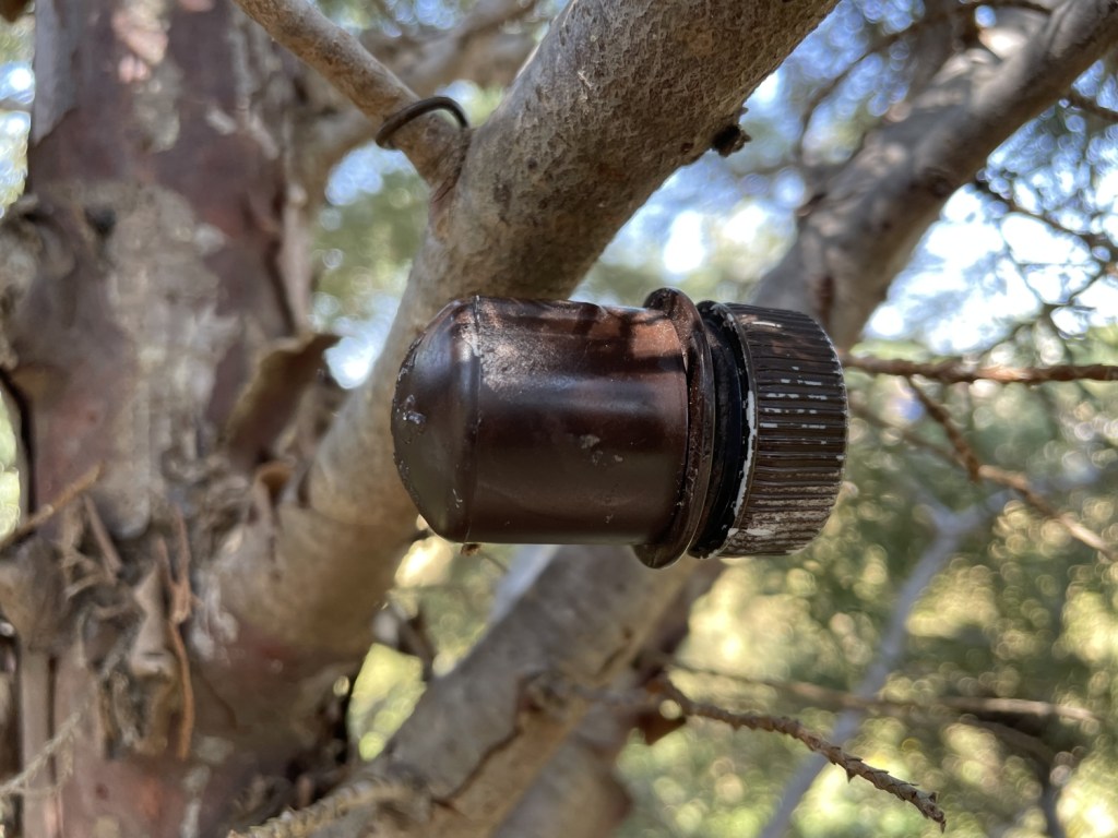 I set off later than I had intended. I wanted to head out early in the morning while it was even cooler, but my Sunday morning bed held me in longer than expected. It was quite insidious. But I managed to get out in the “cool” weather eventually. My first attempt left me a little cold (metaphorically), a rock cache hidden amongst a small bed of rocks. I gave it about ten minutes before realizing I just wasn’t feeling it. I readjusted to a nearby Multi-cache. I drove half a mile down the road to a nearby ice cream stand. The redirector was something I could see from the car, making it easy enough to get corrected coordinates. Then I drove a mile in the opposite direction to a parking lot, and near that parking lot was a line of trees, and in one of those trees was the cache.