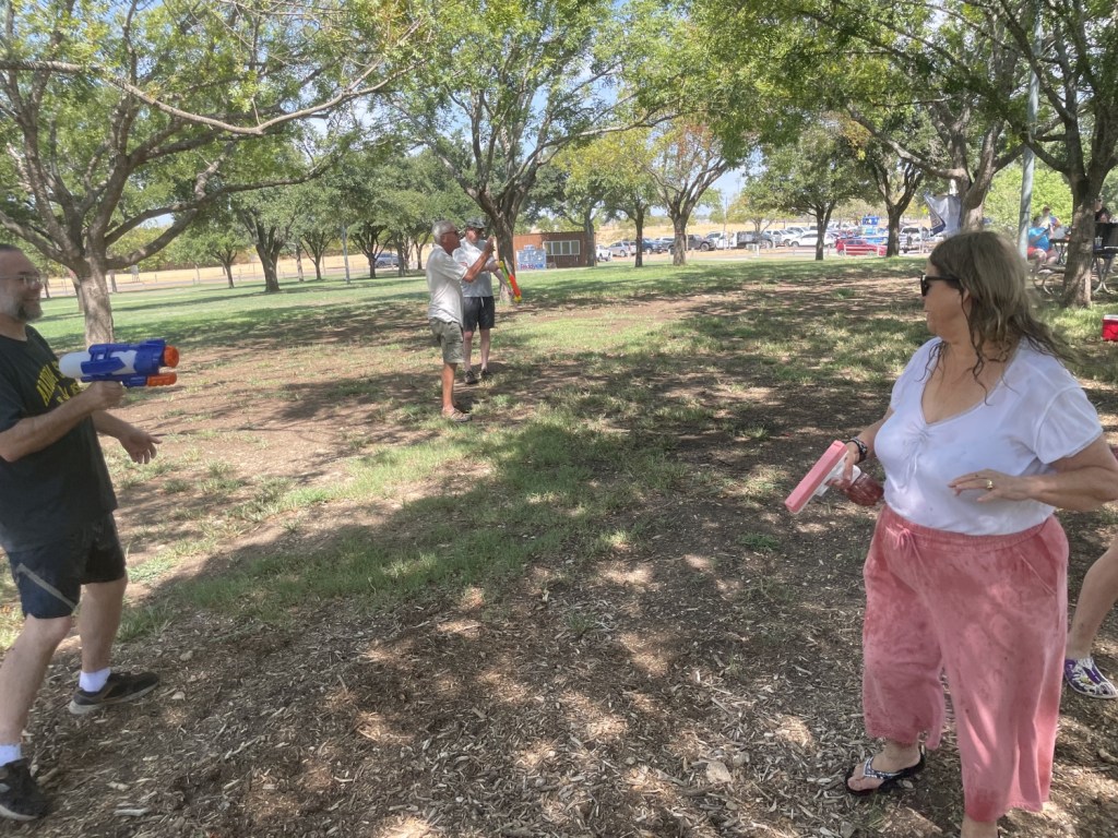We filled balloons under the shade of park trees. Some thought this could be considered a waste of valuable water during a drought. I rationalized that since we would be doing it on earth and not on cement, the water would not be wasted but would circle back to plants, not evaporate beneath the blazing sun. Not that it was actually “blazing,” mind you. We were lucky to have a bit of cloud cover to make the day more comfortable. I also came prepared. I had recently acquired a motorized water gun for the occasion. It did not offer the deep drenching that something like a Super Soaker would, but it did offer distance and sustained fire (or water, as the case may be) that would barely be matched. Other cachers trickled to our location in various levels of comfortable and water-intended dress, some with weapons, others with balloons. I ended up as the first serious drenching victim. A balloon toss, meant to test the material’s ability to explode upon impact, managed to miss the ground and land perfectly in the hollow of my clavicle. I was soaked before we even began, but I had also acquired my first target. As the moment approached, I counted down the minutes and then the seconds, and at high noon, all heck broke loose!