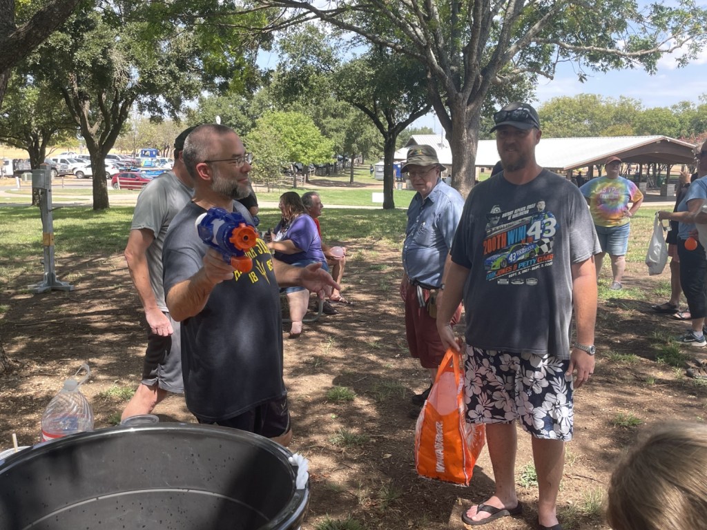 Many, many moons ago, the House of PodCacher suggested the idea of holding flash mobs of geocachers. So in 2007, the first World-Wide Flash Mob (WWFM) was born, encompassing twenty events in two countries. People seemed to think it was a good idea because it kept happening, at first every six months, and eventually yearly. This past weekend was the twentieth WWFM. As some of you may know, Texas is undergoing a heat wave of epic proportions this summer. This is not usually a time that anyone would want to be outside in a group for any reason. That is why our host, Bigguy In Texas, made it something many could not refuse. We were invited to bring water balloons and water guns and drench each other in curiously cooling combat!