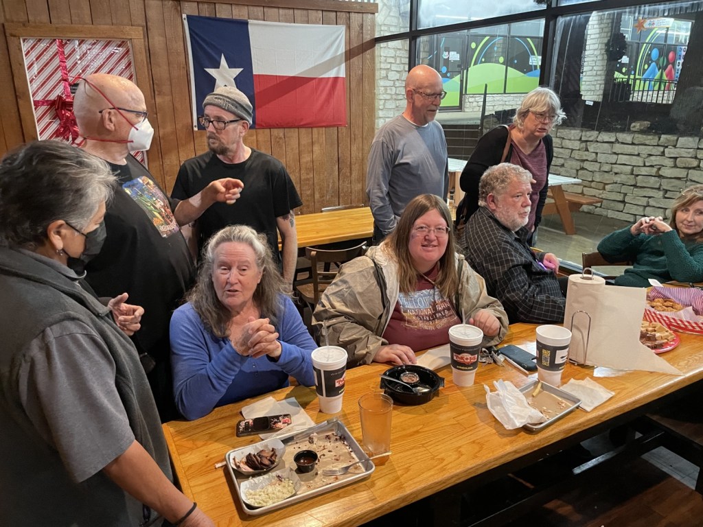 Last night, I attended an Event devoted to the winter solstice. Local cachers have been putting it on each solstice for a decade (long before I started), though it was suspended during the Time of Cholera. I was impressed by the turnout. Twenty or twenty-five people showed up (including a few folks I don’t know that well and recent travel alumnae 4everlyn, Krissy4884, and Razorbackgirl) to eat (mediocre) barbeque and talk lives, holidays, and caching. Some of the news was good (one of us who just recently had heart surgery was in attendance); some news was bad (one of us who has cancer has to start a new treatment); but (as in days of old) we feasted, looking forward to the end of early darkness and the return of longer days.