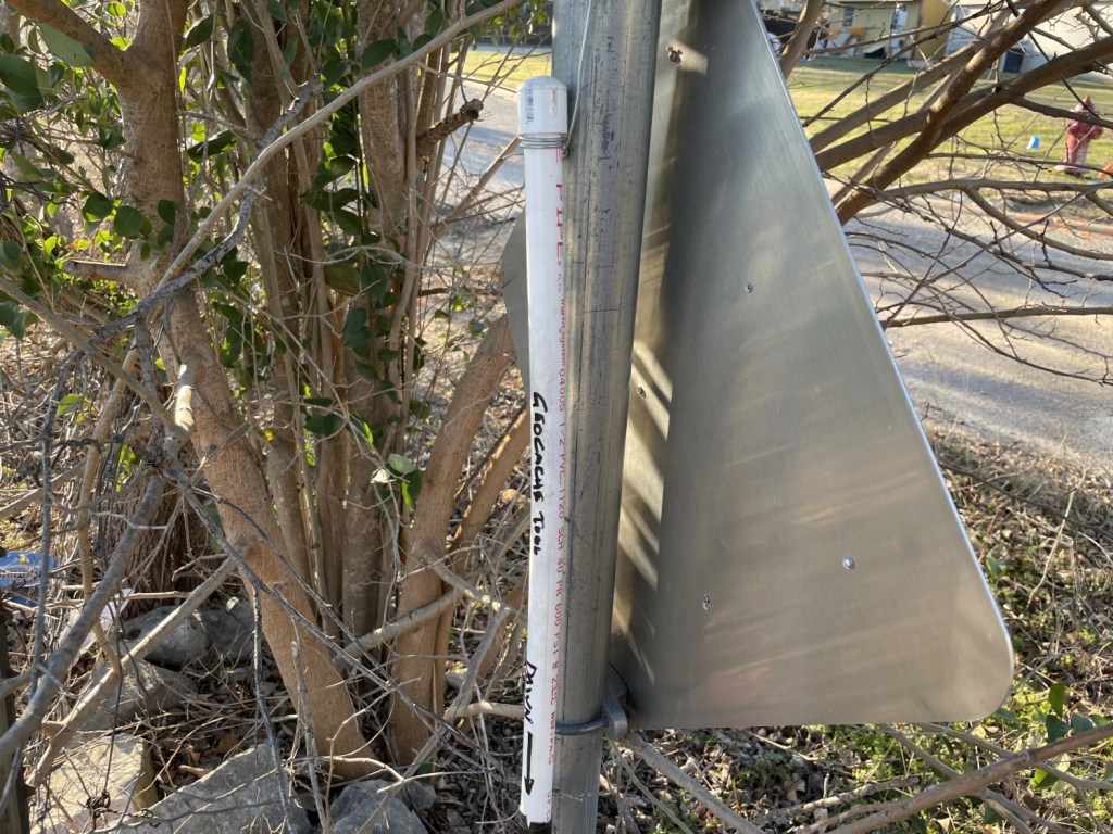 I put the tool in the pipe and reached downward, but no joy. I reached and groped around as my fingers started to go numb in the breezy twenty-five-degree air. Was I doing it wrong? I didn’t have time to think about it much as someone came out of a nearby house with a dog on a leash, looking in my direction. My proverbial spidey senses were blaring, but I found myself in an awkward position. Often, I try to present my search in a way where I might have some plausible deniability. Often, having my clipboard, using my phone to “take photos,” or entering fake info on a simulated app is enough to make me look official. Playing with PVC in a metal pole? Not so much. I mentally prepared myself for a conversation when the homeowner said, “You’re half right!”