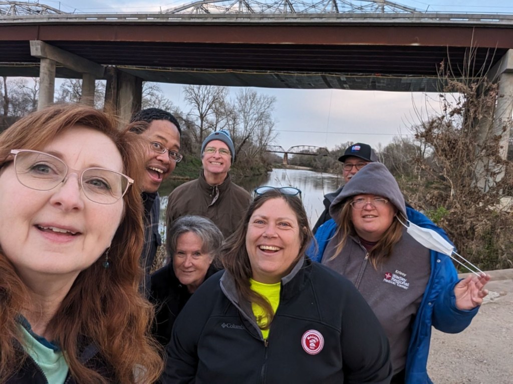 When we were done with the CITO, we went across town to a freshly published EarthCache that required, along with answers about erosion and the meandering of the Texas Colorado River, a photo of the claiming cachers. Behold the TexaSix (plus caching friend, SparkyIV)!