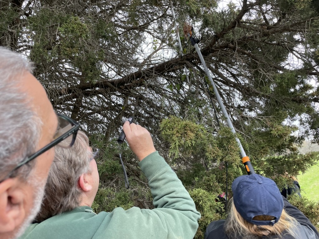1Fiskars refers to a pole with a branch cutter on the end, used to drop caches placed on high limbs that can’t be reached any other way. The cutter is used to cut the small branch that the cache is attached to, then replace the cache by holding open the cache clip to place it on another branch.