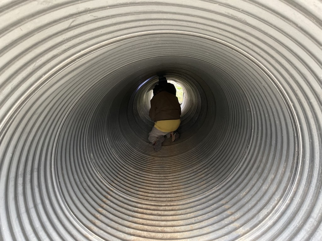 We braved thorny greenbriers, culverts, and the clever machinations of a hider who desired our success and our failure in equal measure. The best cache of all (in my humble opinion) involved a tunnel under a hill.