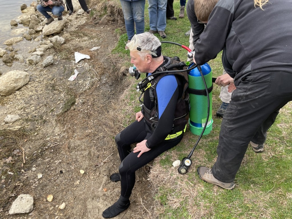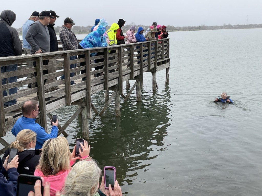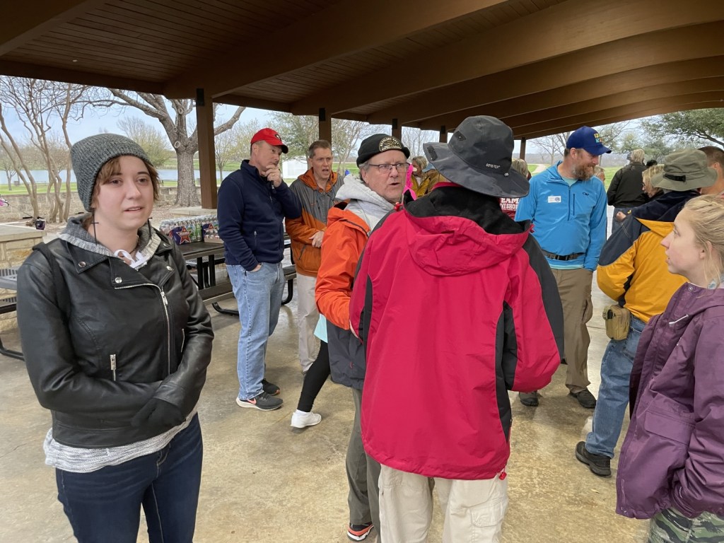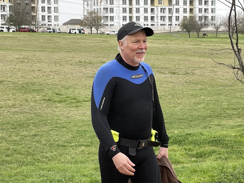 One cache, however, required special assistance. Few of us (and by “few,” I really mean none) were equipped to handle an actual scuba cache. Luckily, TXGA President BE Viking took the plunge for us! Donning scuba gear, he sank below the waters of Lake Pflugerville to bring up the log for the cache, giving us a chance to sign an actual scuba cache! I wonder if he’ll replicate the feat for the Texas Challenge on March 16 in Wichita Falls. Yes, that is an unsubtle and blatant plug. What of it?