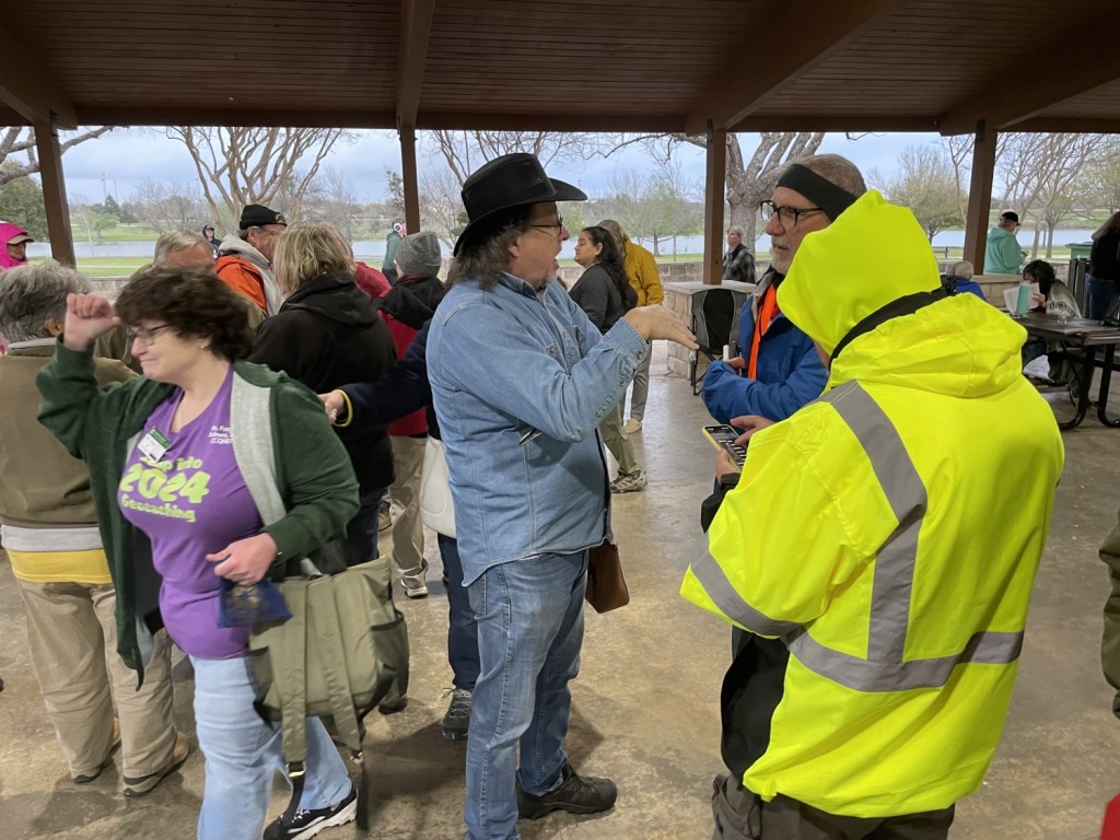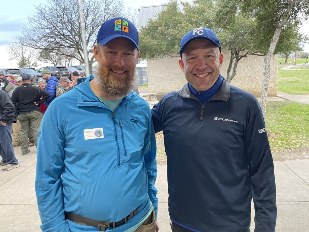 The dive put us back in Round Rock just in time for the Mega! Of course, some people in attendance were not at the Mega, having instead chosen to wander the park, finding all the newly placed and older surviving caches. Others of us gathered to commune with one another. I was surprised to run into a cacher I had met a year and a half before at Geowoodstock in British Columbia. She owned one of the two trackables I had returned to their owners! It’s a small world, and it’s getting smaller every day! I missed a talk my friend Moosiegirl gave on snake behavior and identification, but I caught one by BounceBounce on gadget caches. The most important guest, of course, was the legend himself …