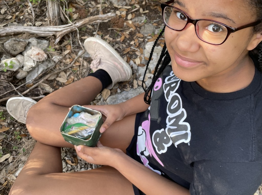 The girls made it down from scenic L-Town to spend a week with me in Austin, as they have in years past. Unfortunately, I couldn’t take the entire week off to take them out on a road trip to cache, but I could drag them out with me to grab my daily cache. At least one of those caches involved ice cream and an Event. Others involved a good old-fashioned hunt as is mete and proper. I owe one of the caches we visited to the girls. I’d tried to find a cap-n-cap in a tree on a couple of occasions, but my older daughter was the first of us to find it. My younger daughter, with the help of my ladder, took a shot at climbing up to it. We eventually realized that, while she could get it down, she wouldn’t be able to return it to its perch. Had I my pole in its normal place in my trunk (I lent it to a friend to use it for its original purpose: painting), we would have been able to grab and replace it easily enough. Without it, we came up blank. Tragic, but thus is life. Later, we decided to cherchez la easy. I had been given solutions to a bunch of Mysteries in the area, so we popped over to one nearby. I had seen the puzzle for it before, but it was just complex enough that I had never attempted it. Luckily, visitors from the Northeast made that unnecessary. In full view of an entirely unconcerned muggle, I pulled out the cache from its hiding place. It had been placed before either of the girls was born and hadn’t been found in over a year. We signed the log in the comfort of the car before returning it to its long resting place.