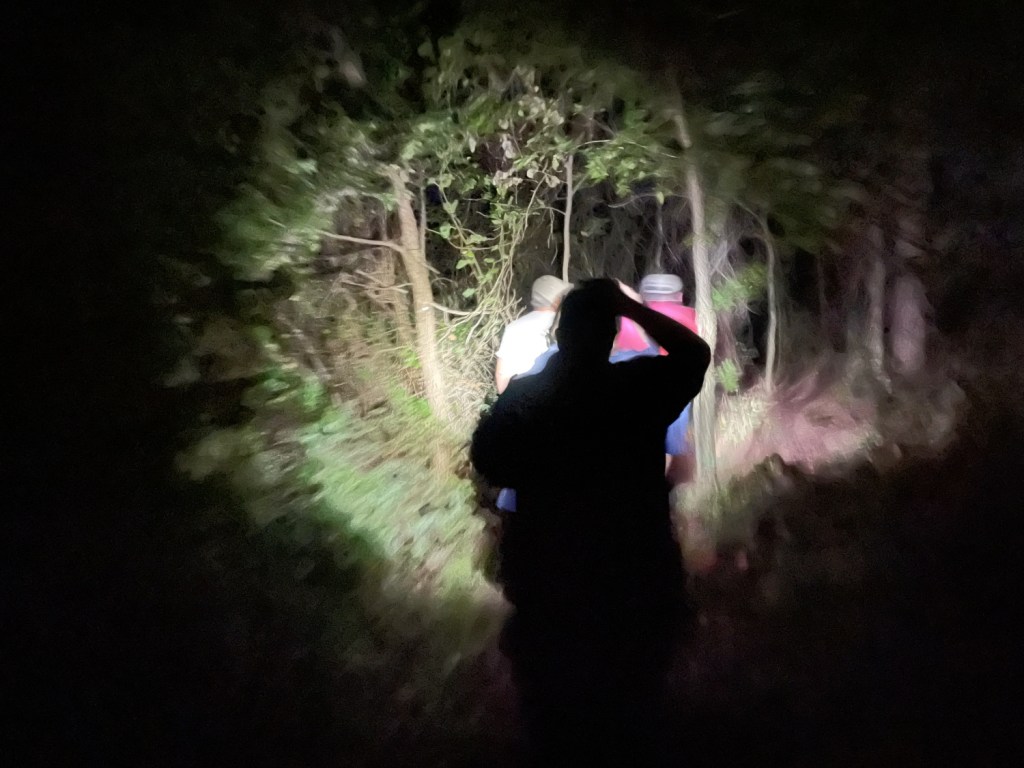 After the Noble Event, we all gathered for dinner and hatched a plot to go get a night cache. I was interested, but the deciding factor for me was that the girls were down for it. Eight of us went out to a nearby lakeside park and took a path into the forest, following FireTacks along the route. I didn’t know about the quarter-mile hike, and I was feeling the weight of the day dragging me down, but I wasn’t going to flag in front of my compatriots, and I was especially not going to falter in front of my little girls. We marched together, armed with our flashlights, until we found the tacks that signaled to turn off the trail. A light bushwhacking began until we found the tacks that signaled we had reached our destination.
