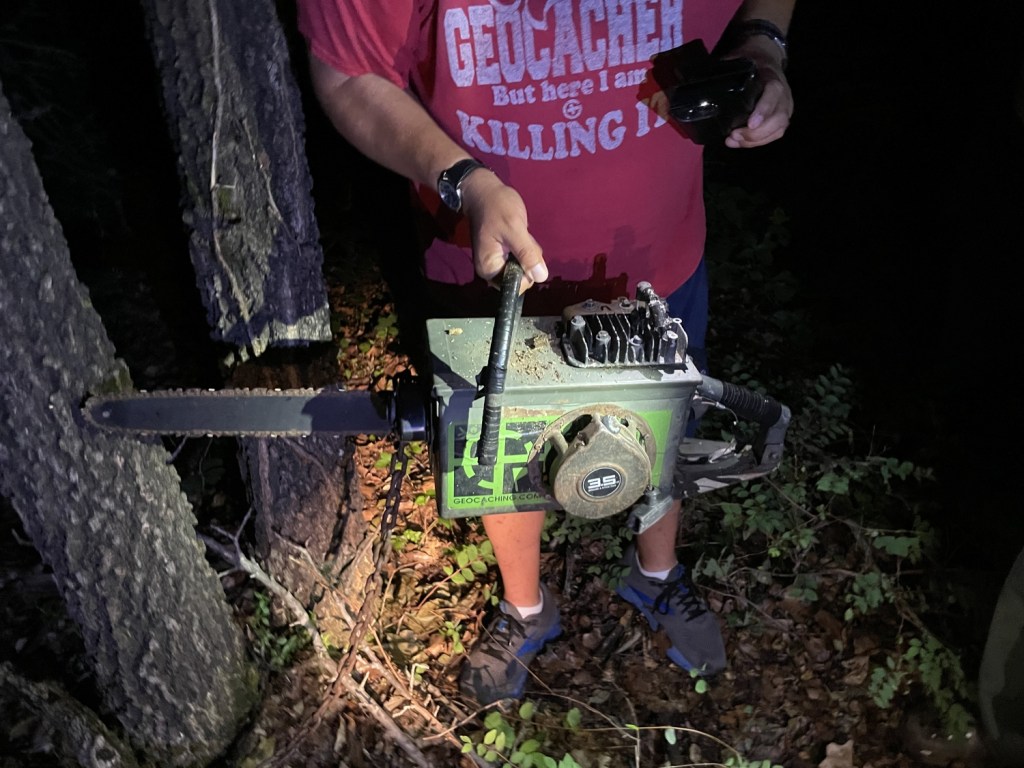 We found a cache that only a serial killer could love. OK, we kinda liked it, too. Once we figured out how to open it, we all put our ink on the log—a final victory at the end of a long day. We all made our way out of the forest and back to our vehicles so we could get back to our lodgings for rest. Our days would continue tomorrow at…