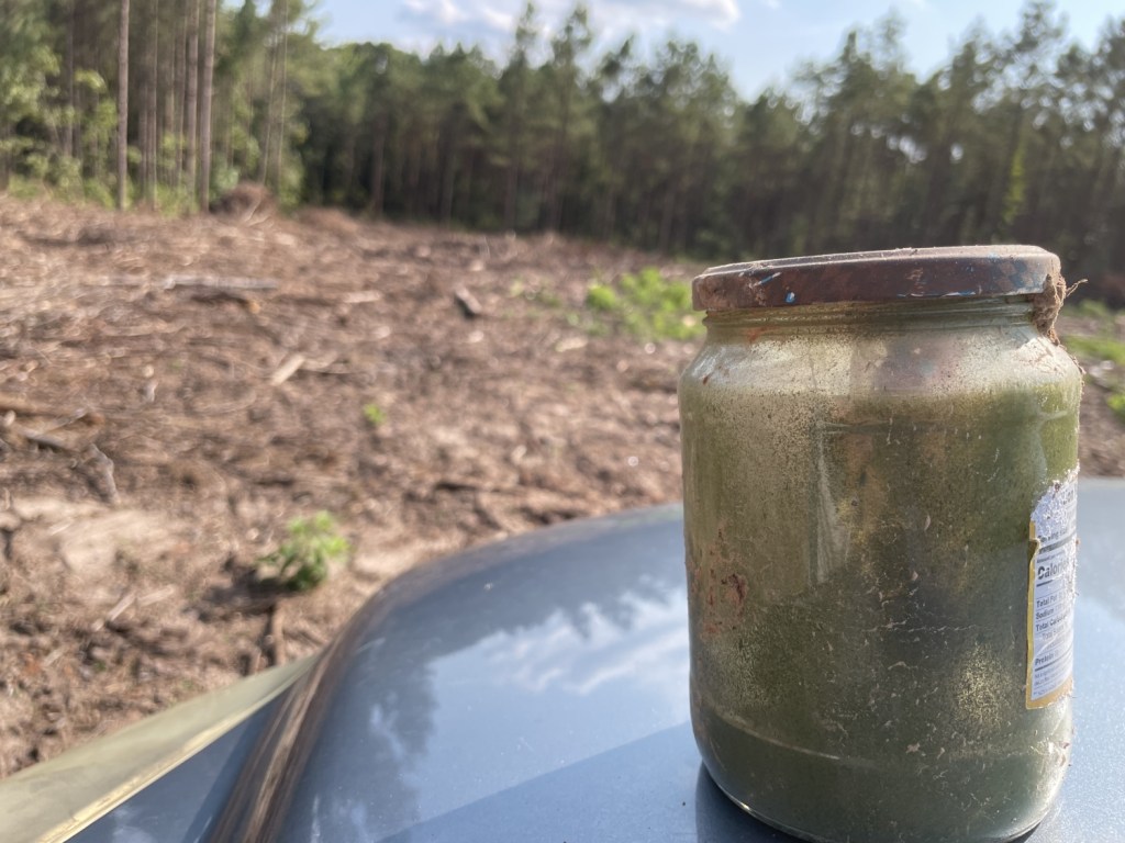 I drove down the highway until I approached my turn. Ready to make a left onto a county road, I was surprised to find a logging road ahead. Suddenly, something made a lot more sense. There was an entire trail of caches along the road. I wondered why none of the more local cachers had gone after it after three weeks of waiting. Knowing they were all hidden in trees along a rough driving trail answered that. I dropped my car into a slightly lower gear and drove into the pines. The ruts were small-but-there as I went forward. I thought that my previous vehicle might not have handled this trail well. When I got to the creek, I knew that it wouldn’t. Luckily, my current vehicle has a higher clearance, so the ruts were fine, and fording was only a moment of consternation. I went through the forest for about two miles until I came to a clearing. Well, it was less a clearing and more of a devastation. Woody detritus was strewn about. Pulled-up stumps lay on their sides. The reason for the FTF being here was clear: loggers had torn the GZ apart. A few minutes of searching brought me my quarry: a glass jar packed with coins, toys, and a fresh, unsullied piece of paper. Inveni, inscripsi, reposui. I then went to log the cache, but reception was terrible in the trees. No matter, though; I would just wait until I got back to the highway. I made the drive back and then logged it, noting the questionable nature of the container. I have said a number of times that glass isn’t the best for a cache, especially with how easily it can break. Unlike previous times, this CO responded to my mention with an explanation. He chose glass specifically because there has been a problem with raccoons and other wild animals chewing up the caches along that trail, and glass resists their efforts. Good thinking, sir! I rescind my criticism!