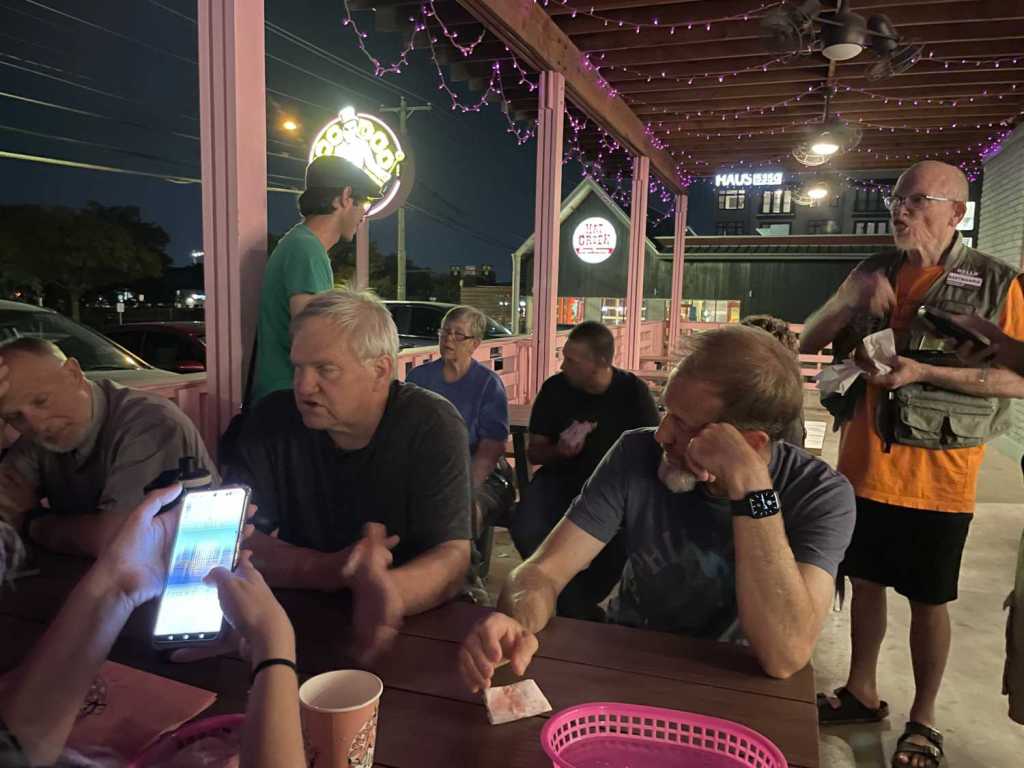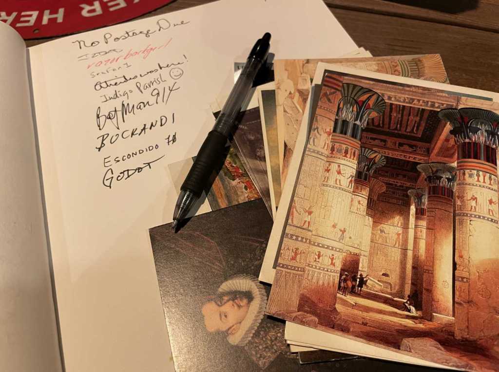 While it’s rare for me to attend multiple Events on the same day, it’s a non-zero occurrence. Yesterday was non-zero as well. I hosted an Event at a local taco place in honor of International Postcard Day. I cracked open the Big Book of Events and once again laid it bare for everyone. Fate offered me a surprising swag opportunity for the assemblage. While doing some clutter-busting last week, I found a bag of postcards. When I worked at a comic book and stationery shop many, many, many years ago, I got some postcards that I thought were cool to eventually send to people. The fact that I still had them all these years later put the lie to that plan, so I offered them up to the attendees, and a few of them took me up on the offer. There were familiar faces, several of whom have appeared in previous pages I’ve penned. I had gotten a few “Will Attend”s from newer cachers, but I fear that life may have gotten in the way (as it is wont to do). Regardless, all of us engaged in a little taco diplomacy. But instead of talking long past the official end of the Event, everyone began to slip off a bit early to the second Event of the evening.