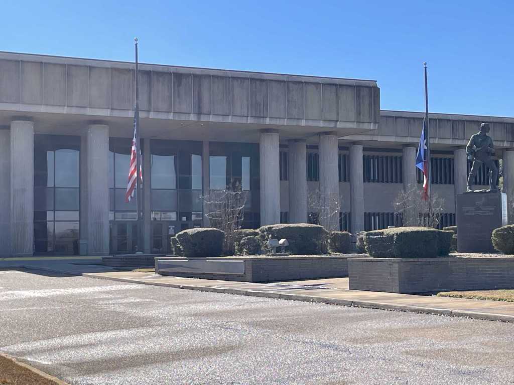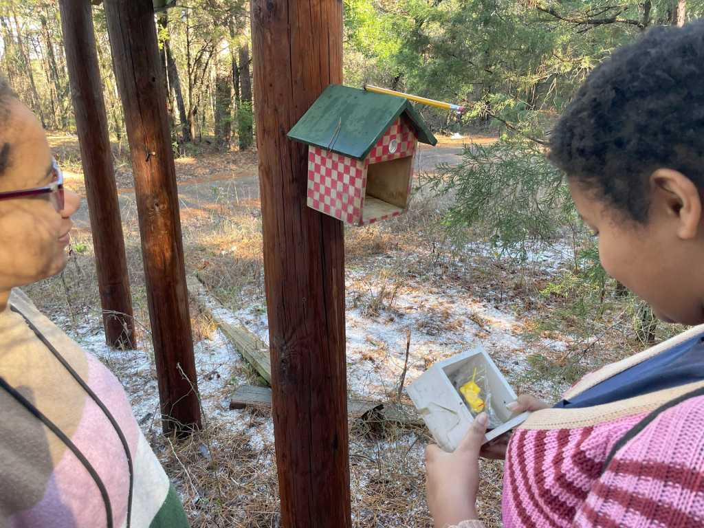 Because of our limited time (thanks to short days) and our detour into Arkansas (Texarkana was a bit of a detour), we only had time for one more county, and only one was on the way back to Longview. That’s how we ended up passing through Daingerfield. The first cache was easy enough: a Virtual at a local high school closer to the edge of the county. We were initially suspicious of all the cars there on a Saturday, but there was a basketball game, so that made sense. We found what we needed there and then continued south toward town. A Traditional was on a side road, which may have originally been a logging road until a couple of people built houses on it. In a shady spot near an access gate, we trudged over a last bit of ice untouched by the sun and found a birdhouse on a post. And once we signed its log, we were done for the day.