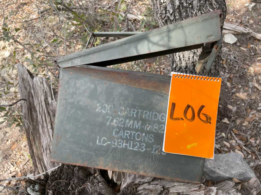 Finding an ammo can in the woods is always nice, especially inside the city. It involved a couple of minor inconveniences, the biggest being that it’s placed on the wooded hillside overlooking a charter school complex. I’m not enamored of being close to a school, but I cast no blame for that. I’m pretty sure it was just an office building when the cache was placed. Unfortunately, I chose to go find it during pickup time and turned into the wrong parking lot. It was a little difficult driving against the flow of the lined-up traffic to get out. I still managed to make it out of the wrong lot and into the right one near the trailhead. As I walked up the hill, I saw something odd—something I’m not sure I’ve encountered before. You’ve all seen rock stacking, right? Well, all along the path up the hill, I saw rocks obviously placed in tree elbows or balanced on tree limbs. I thought for a moment that they might be cairn equivalents, but why would they be needed on an already well-defined path? No matter. After a few different readings to triangulate ground zero and almost triangulating myself into a ditch, I found my quarry. Inveni, inscripsi, reposui.