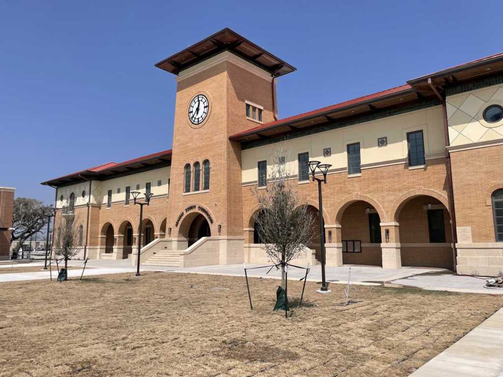 So the girls and I were driving out of Rockport when I saw the top of a large building a couple of blocks over from the highway. It didn’t have a cross on top, so it wasn’t a church. I wasn’t aware of any colleges there and didn’t think the town was large enough for one anyway. I drove past it but decided, as the driver and highest-ranking person on the trip, to turn back and check it out. Having seen so many courthouses worked in my favor because I was chuffed to read the building title above the door: Aransas County Courthouse! It was still under construction, but none of the lunching workers attempted to stop me as I photographed it. The cornerstone had been laid last year. I saw neither workers nor staff going into the building nor any sign that it was open, but I couldn’t be sure it wasn’t in use. All I knew was that horrid storefront from before was now a store, as it should be. The county is finally vindicated!