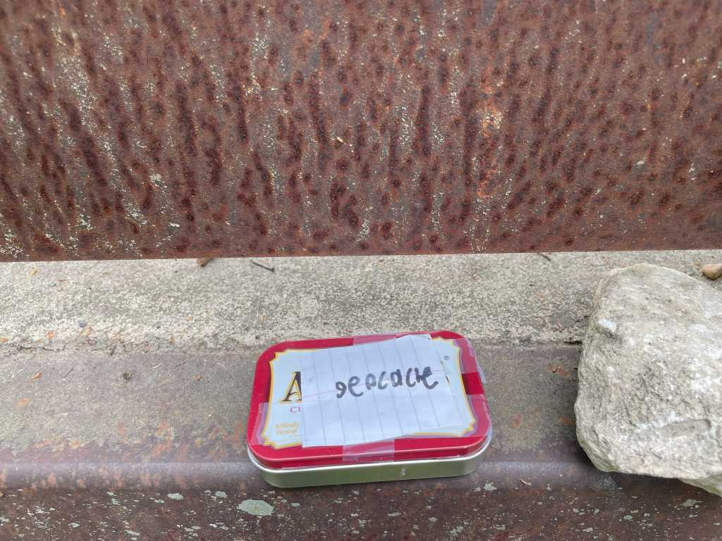 All that said, I sat in my car for a moment, looking at the bridge. I always thought it was a terrible spot to put a cache, but it was right there, and there would never be a good time for it, so I would probably never have a better time than that moment. I took a deep breath, got out of the car, and just did it. It was easy enough to find, and I had minimal muggle interaction outside of a toddler who smiled at me while her mom intently focused on her phone. I signed the fresh paper, unsullied by any other signatures, and put it back in its rock-covered bolt hole to be found by the next cacher to come along. Then I beat a hasty retreat to my car.
